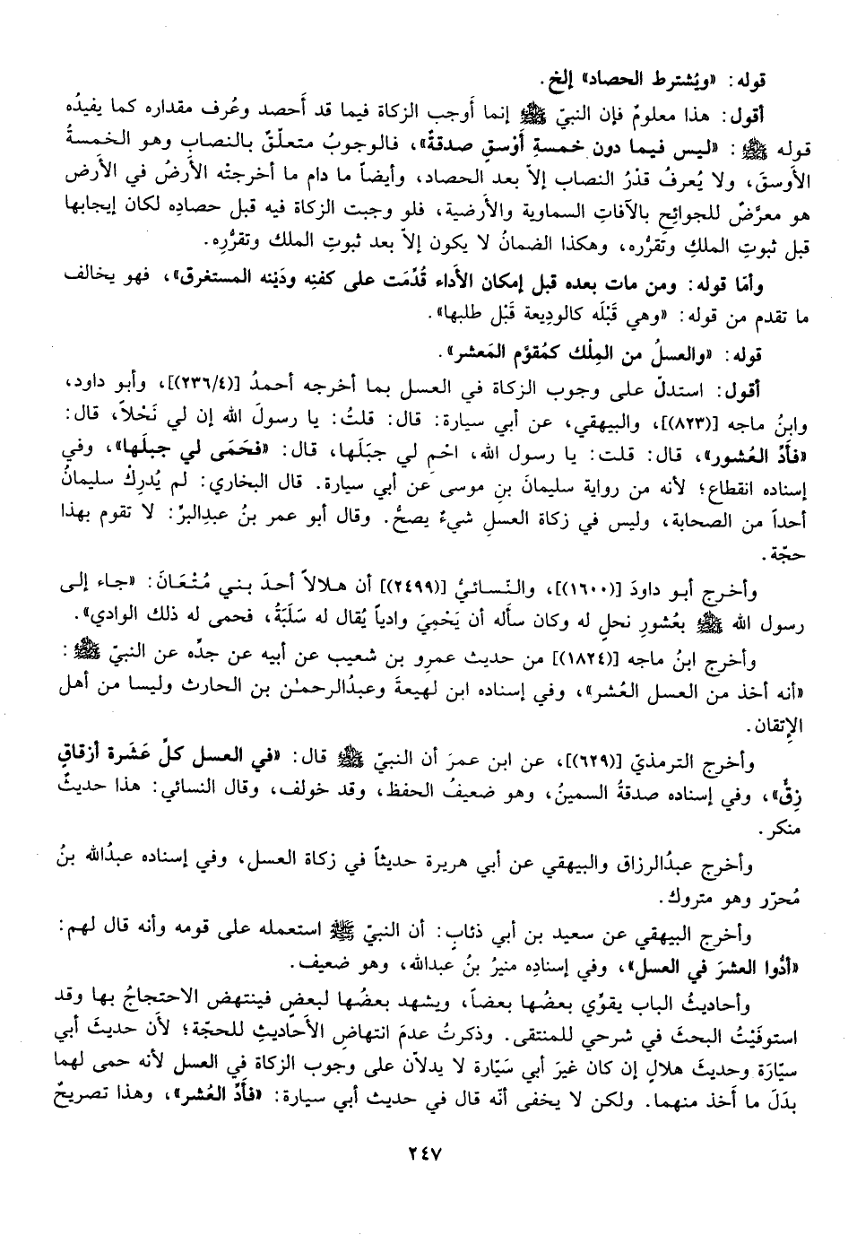 أقول: استدل على وجوب الزكاة في العسل بما أخرجه أحمد ["4/236"، وابو دأود "وابن ماجه "823"] ، والبيهقي قال: قلت: يا رسول الله إن لي نحلا قال: "فأد العشور" قال: قلت: يا رسول الله احم لي جبلها قال: فحمى لي جبلها وفي إسناده انقطاع لانه من رواية سليمان بن موسى عن أبي سيارة قال البخاري لم يدرك سليمان احدا من الصحابة وليس في زكاة العسل شيء يصح وقال أبو عمر بن عبد البر لا يقوم بهذا حجة.