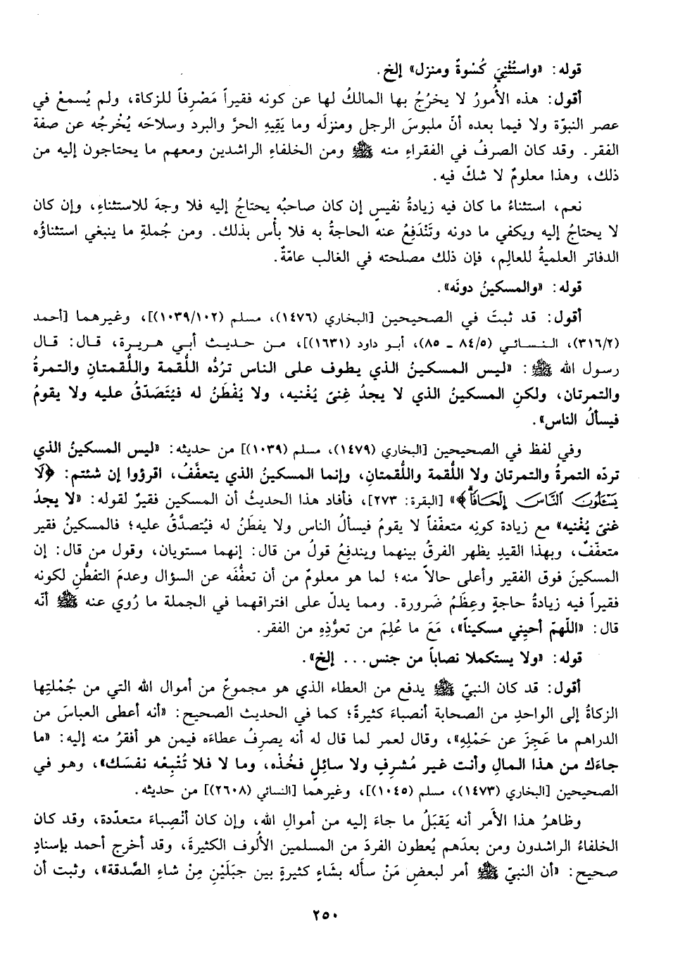 وفي لفظ في الصحيحين [البخاري "1479"، مسلم "1039"] ، من حديثه: "ليس المسكين الذي ترده التمرة والتمرتان ولا اللقمة واللقمتان وانما المسكين الذي يتعفف اقرأوا ان شئتم {لا يَسْأَلونَ النَّاسَ إِلْحَافاً} [البقرة: 273] ، فأفاد هذا الحديث ان المسكين فقير لقوله: "لا يجد غنى يغنيه" مع زيادة كونه متعففا لا يقوم فيسأل الناس ولا يفطن له فيتصدق عليه فالمسكين فقير متعفف وبهذا القيد يظهر الفرق بينهما ويندفع قول من قال انهما مستويان وقول من قال ان المسكين فوق الفقير واعلى حالا منه لما هو معلوم من ان تعففه عن السؤال وعدم التفطن لكونه فقيرا زيادة حاجة وعظم ضرورة ومما يدل على افتراقهما في الجملة ما روى عنه صلى الله عليه وسلم انه قال: "اللهم احيني مسكينا"، مع ما علم من تعوذه من الفقر.