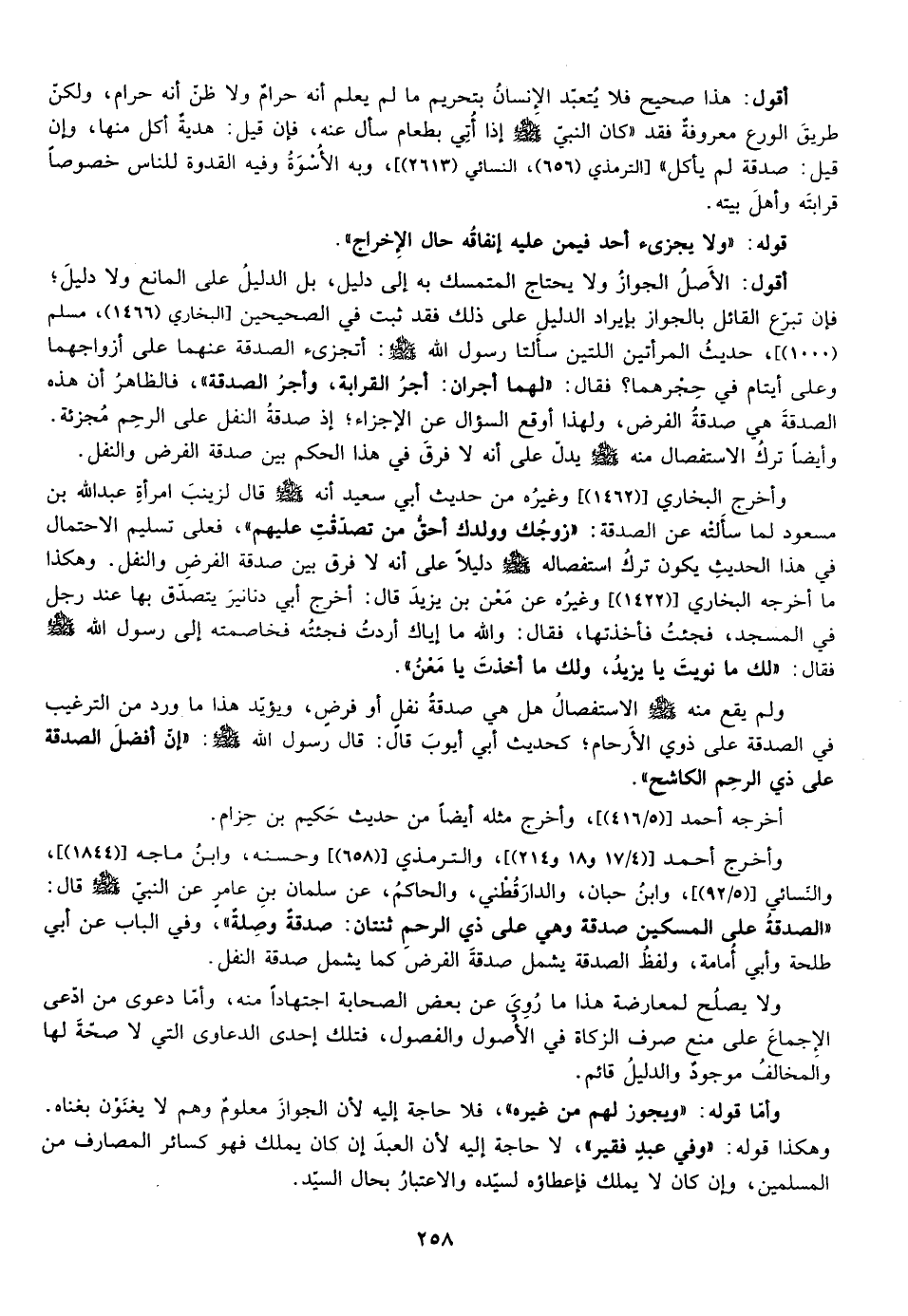 وأخرج البخاري وغيره من حديث أبي سعيد انه صلى الله عليه وآله وسلم قال لزينب امرأة عبد الله بن مسعود لما سألته عن الصدقة: "زوجك وولدك أحق من تصدقت عليهم"، فعلى تسليم الاحتمال في هذا الحديث يكون ترك استفصاله صلى الله عليه وسلم دليلا على انه لا فرق بين صدقة الفرض والنفل وهكذا ما أخرجه البخاري وغيره عن معن بن يزيد قال أخرج أبي دنانير يتصدق بها عند رجل في المسجد فجئت فأخذتها فقال والله ما إياك اردت فجئته فخاصمته إلي رسول الله صلى الله عليه وسلم فقال: "لك ما نويت يا يزيد ولك ما اخذت يا معن".