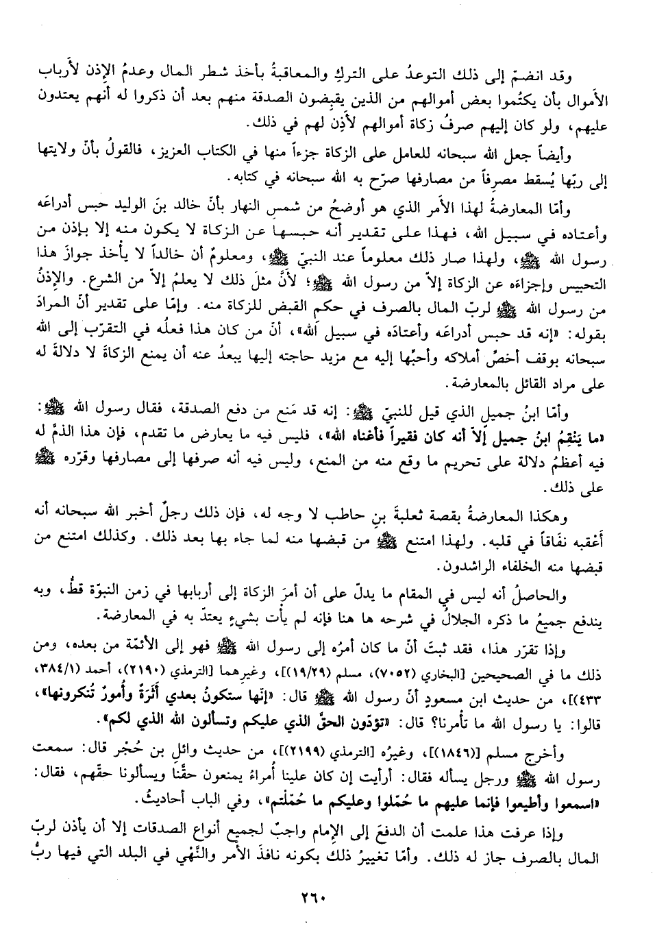 وأما ابن جميل الذي قيل للنبي صلى الله عليه وسلم إنه قدمنع من دفع الصدقة فقال رسول الله صلى الله عليه وسلم: "ما ينقم ابن جميل الا انه كان فقيرا فأغناه الله" فليس فيه ما يعارض ما تقدم فإن هذا الذم له فيه اعظم دلالة على تحريم ما وقع منه من المنع وليس فيه انه صرفها إلي مصارفها وقرره صلى الله عليه وسلم على ذلك.