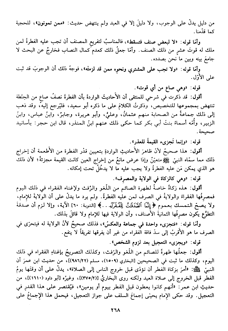 أقول: جعلها ظهرة للصائم من اللغو والرفث وكذلك التصريح باغناء الفقراء في ذلك اليوم وكذلك ما ثبت في الصحيحين وغيرهما من حديث ابن عمر ان النبي صلى الله عليه وسلم أمر بزكاة الفطر ان تؤدى قبل خروج الناس إلي الصلاة يدل على ان وقتها يوم الفطر قبل الخروج إلي صلاة العيد ولكنه روى البخاري وغيره من حديث ابن عمر انهم كانوا يعطون قبل الفطر بيوم أو يومين فيقتصر على هذا القدر في التعجيل وقد حكى الامام يحيى إجماع السلف على جواز التعجيل فيحمل هذا الاجماع على