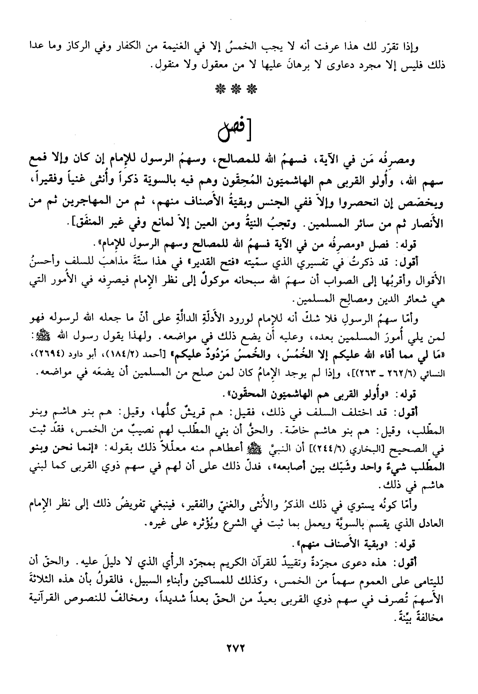 أقول: قداختلف السلف في ذلك فقيل هم قريش كلها وقيل هم بنو هاشم وبنو المطلب وقيل هم بنو هاشم خاصة والحق ان بني المطلب لهم نصيب من الخمس فقد ثبت في الصحيح ان النبي صلى الله عليه وسلم اعطاهم منه معللا ذلك بقوله: "إنما نحن وبنو المطلب شيء واحد وشبك بين أصابعه" فدل ذلك على ان لهم في سهم ذوى القربى كما لبني هاشم في ذلك.