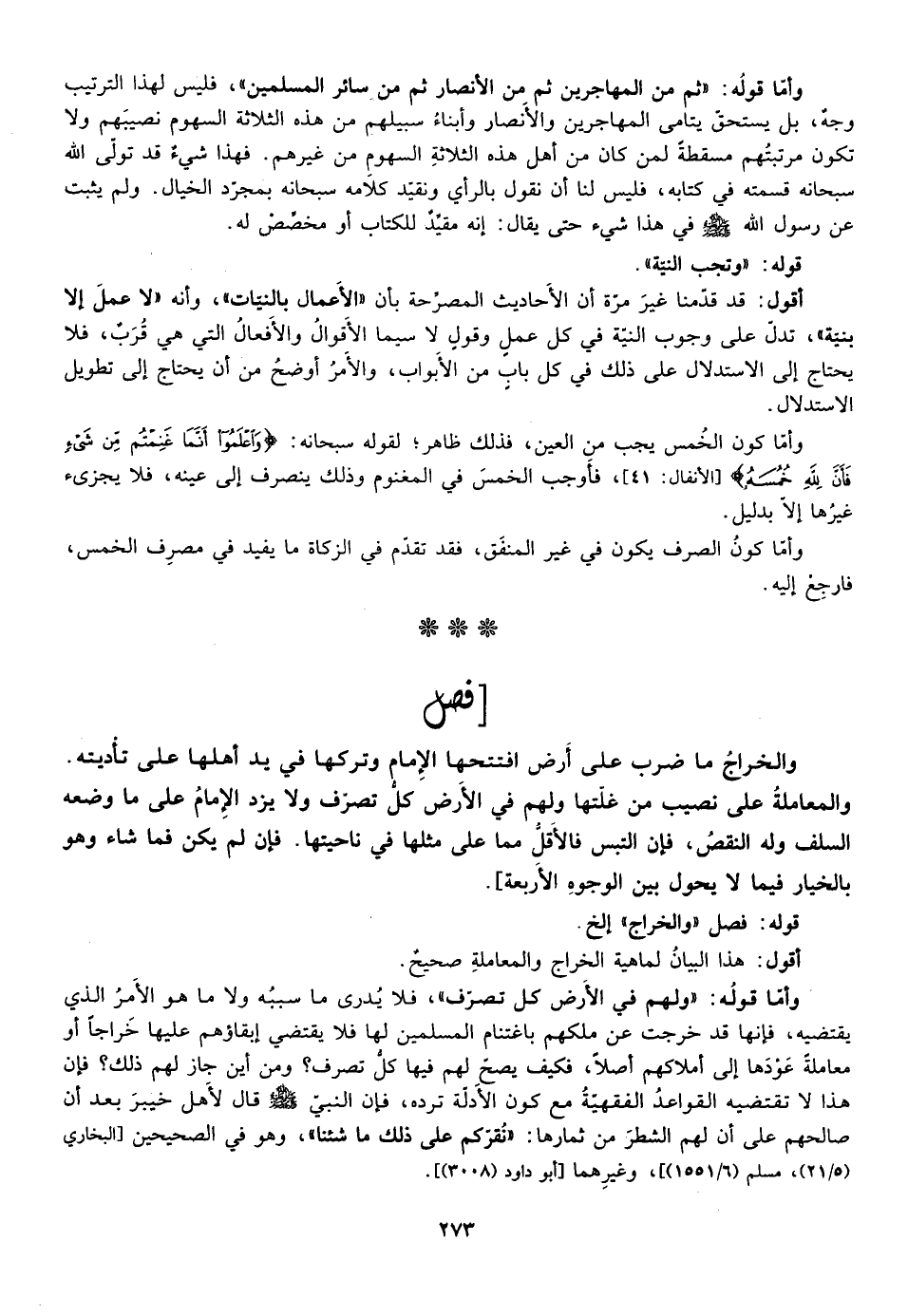وأما قوله: "ولهم في الأرض كل تصرف" فلا يدرى ما سببه ولا ما هو الامر الذي يقتضيه فإنها قد خرجت عن ملكيتهم باغتنام المسلمين لها فلا يقتضي ابقاؤهم عليها خراجا أو معاملة عودها إلي ملكهم اصلا فكيف يصح لهم فيها كل تصرف ومن اين جاز لهم ذلك فإن هذا لا تقتضيه القواعدالفقهية مع كون الادلة ترده فإن النبي صلى الله عليه وسلم قال لأهل خيبر بعد أن صالحهم على أن لهم الشطر من ثمارها: "نقركم على ذلك ما شئنا"، وهو في الصحيحين [البخاري "5/21"، مسلم "6/1551"] ، وغيرهما [أبو دأود "3008"] .