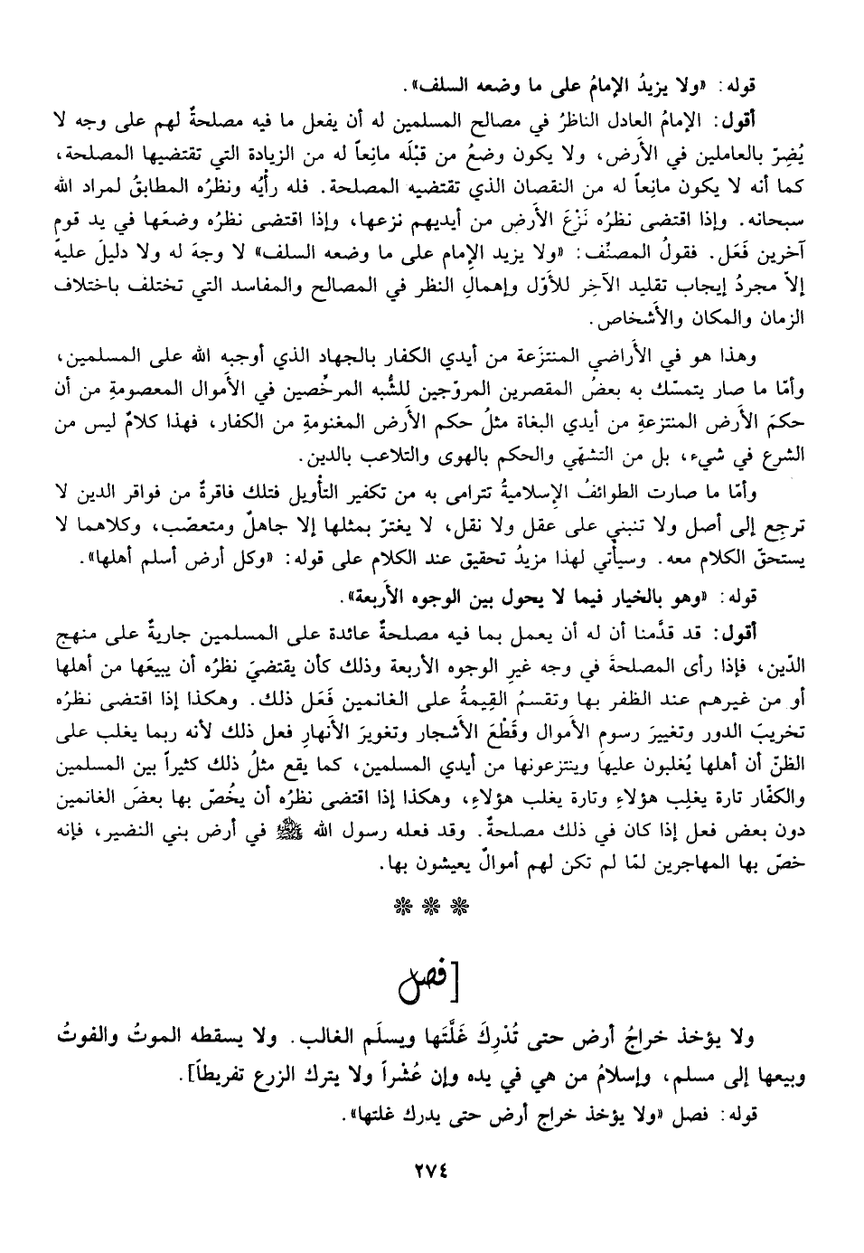 وهذا هو في الاراضي المنتزعة من ايدي الكفار بالجهاد الذي أوجبه الله على المسلمين وأما ما صار يتمسك به بعض المقصرين المروجين للشبه المرخصين في الاموال المعصومة من ان حكم الارض المنتزعة من ايدي البغاة مثل حكم الارض المغنومة من الكفار فهذا كلام ليس من الشرع في شيء بل من التشهي والحكم بالهوى والتلاعب بالدين.