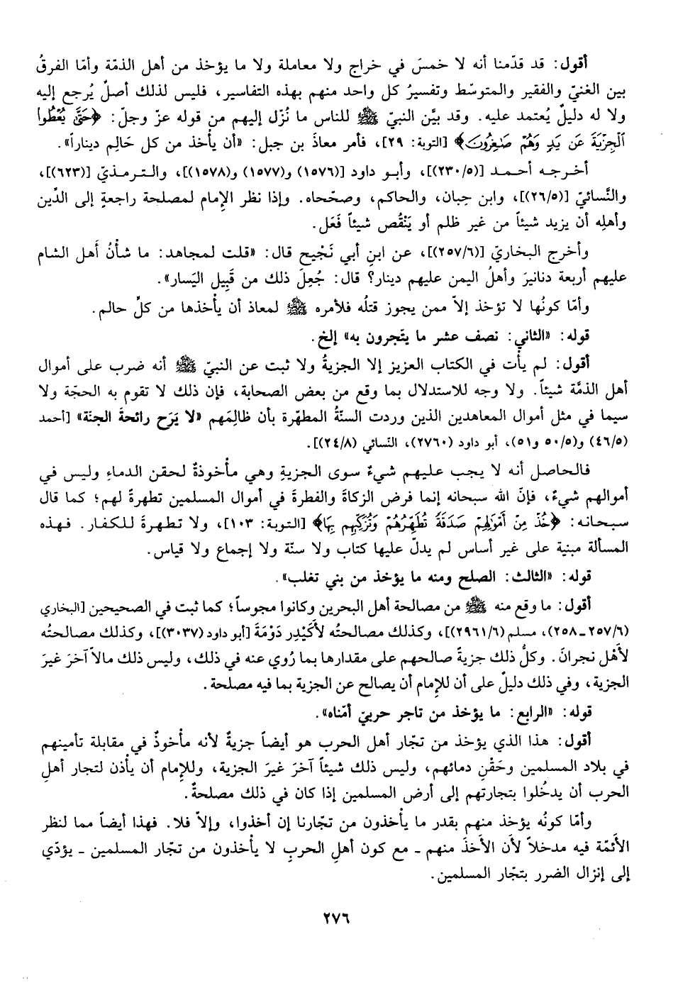 أقول: لم يات في الكتاب العزيز الا الجزية ولا ثبت عن النبي صلى الله عليه وسلم انه ضرب على اموال أهل الذمة شيئا ولا وجه للاستدلال بما وقع من بعض الصحابة فإن ذلك لا تقوم به الحجة لا سيما في مثل اموال المعاهدين الذين وردت السنة المطهرة بأن ظالمهم "لا يرح رائحة الجنة" [أحمد "5/46، 5/50"، أبو دأود "2760"، النسائي "8/24"] .
