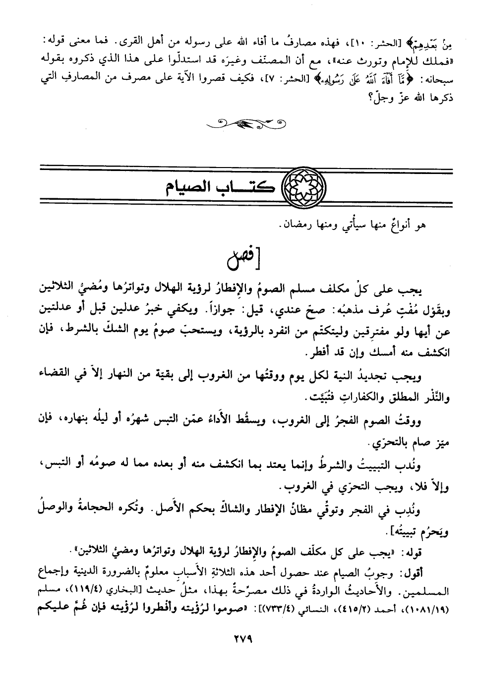 ويجب تجديد النية لكل يوم ووقتها من الغروب إلي بقية من النهار الا في القضاء والنذر المطلق والكفارات فتبيت. ووقت الصوم الفجر إلي الغروب ويسقط الأداء عمن التبس شهره أو ليله بنهاره فإن ميز صام بالتحري.