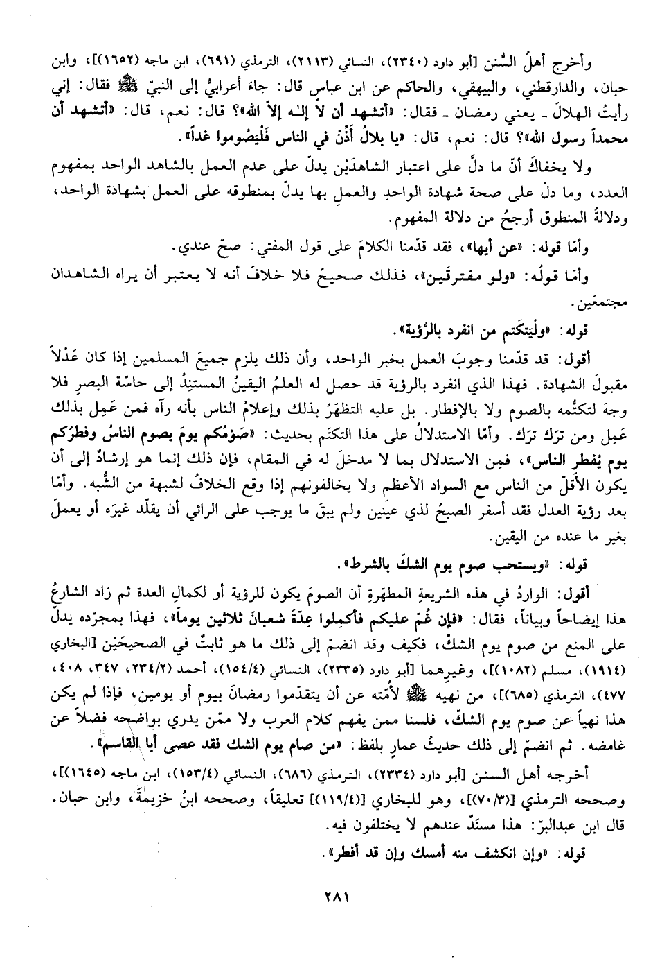 وأخرج أهل السنن [أبو دأود"2340"، النسائي "2113"، الترمذي "691"، ابن ماجة "1652"] ، وابن حبان والدارقطني والبيهقي والحاكم عن ابن عباس قال جاء اعرأبي إلي النبي صلى الله عليه وسلم فقال إني رأيت الهلال يعني رمضان فقال: "أتشهد ان لاإله الا الله؟ " قال: نعم, قال: "أتشهد ان محمدا رسول الله؟ " قال: نعم, قال: "يا بلال أذن في الناس فليصوموا غدا".