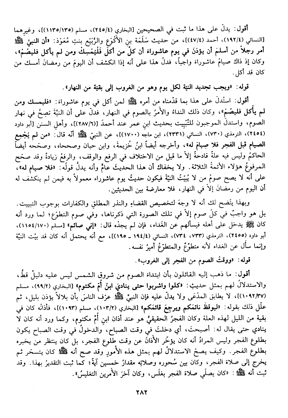 أقول: ما ذهب اليه القائلون بأن ابتداء الصوم من شروق الشمس ليس عليه دليل قط والاستدلال لهم بمثل حديث: "كلوا واشربوا حتى ينادي ابن أم مكتوم" لا يطابق المدعى ولا يدل عليه فإن النبي صلى الله عليه وسلم عرف الناس بأن بلالا يؤذن بليل ثم علل ذلك بقوله: "ليوقظ نائمكم ويرجع قائمكم"، [البخاري "2/103"، مسلم "1093"] ، فإذانه كان في بقية من الليل لهذه العلة وكان الفجر الحقيقي هو عند إذان ابن ام مكتوم وكما ورد انه كان لا ينادي حتى يقال له اصبحت اصبحت أي دخلت في وقت الصباح والدخول في وقت الصباح يكون بطلوع الفجر وليس المراد انه كا يؤخر الإذان عن وقت طلوع الفجر بل كان ينتظر من يخبره بطلوع الفجر وكيف يصح الاستدلال لهم بمثل هذه الامور وقد صح انه صلى الله عليه وسلم كان يتسحر ثم يخرج إلي صلاة الفجر وكان بين سحوره وصلاته مقدار خمسين آية كما ثبت التقدير بهذا وقد ثبت انه صلى الله عليه وسلم كان يصلى صلاة الفجر بغلس وكان آخر الامرين التغليس.