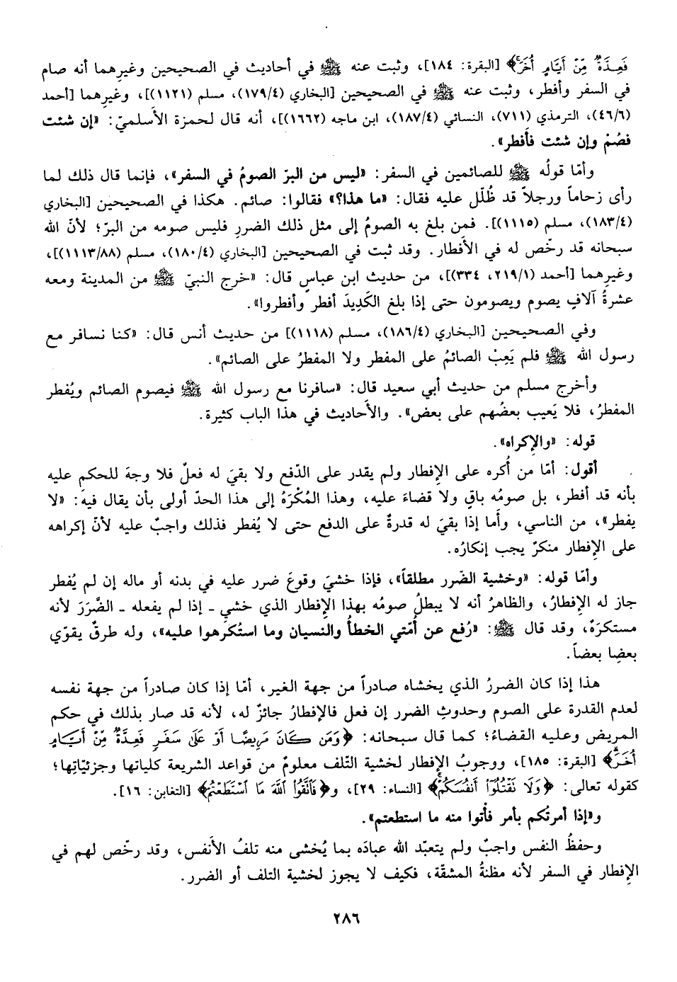 فَعِدَّةٌ مِنْ أَيَّامٍ أُخَرَ} [البقرة: 184] ، وثبت عنه صلى الله عليه وسلم في أحاديث في الصحيحين وغيرهما انه صام في السفر وأفطر وثبت عنه صلى الله عليه وسلم في الصحيحين وغيرهما انه قال لحمزة الاسلمي: "إن شئت فصم وإن شئت فأفطر"،