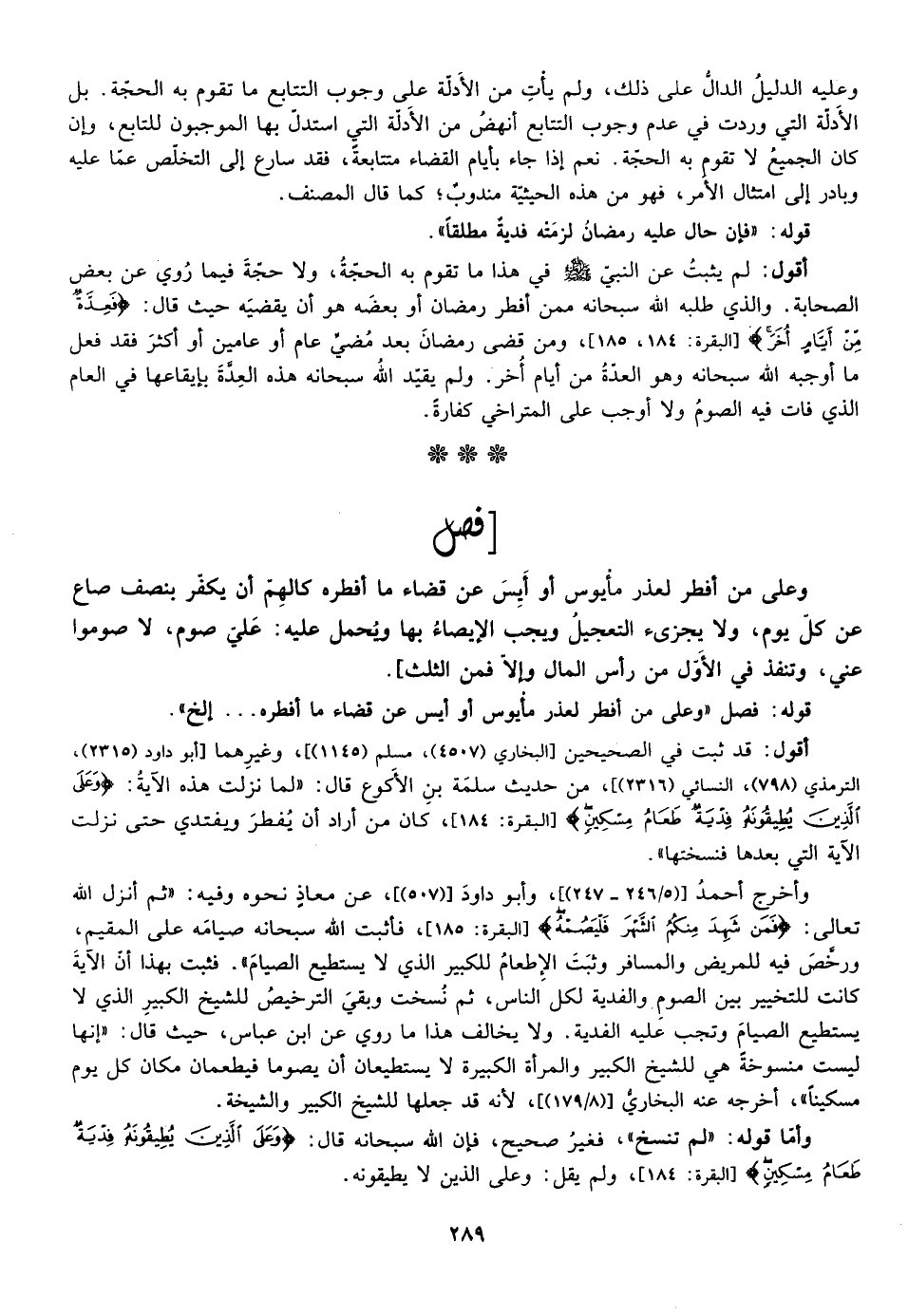وأخرج أحمد وابو دأود عن معاذ نحوه وفيه ثم انزل الله تعالي: {فَمَنْ شَهِدَ مِنْكُمُ الشَّهْرَ فَلْيَصُمْهُ} [البقرة:185] ، فأثبت الله سبحانه صيامه على المقيم الصحيح ورخص فيه للمريض والمسافر وثبت الاطعام للكبير الذي لا يستطيع الصيام فثبت بهذا ان الآية كانت للتخيير بين الصوم والفدية لكل الناس ثم نسخت وبقي الترخيص للشيخ الكبير الذي لا يستطيع الصيام ويجب عليه الفدية ولا يخالف هذا ما روى عن ابن عباس حيث قال إنها ليست منسوخة هي للشيخ الكبير والمرأة الكبيرة لا يستطيعان ان يصوما فيطعمان مكان كل يوم مسكينا أخرجه عنه البخاري لأنه قد جعلها للشيخ الكبير والشيخة.
