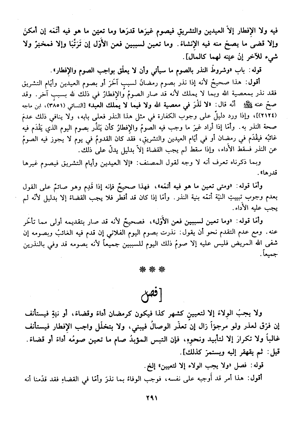 أقول: هذا صحيح لأنه إذا نذر بصوم رمضان لسبب آخر أو يصوم العيدين وأيام التشريف فقد نذر بمعصية الله وبمالا يملك لأنه قد صار الصوم والافطار في ذلك لله بسبب آخر وقد صح عنه صلى الله عليه وسلم أنه قال: "لا نذر في مصعية الله ولا فيما لا يملك العبد" وإذا ورد دليل على وجوب الكفارة على مثل هذا النذر فعلى بابه ولا ينافى ذلك عدم صحة النذر به وأما إذا أراد غير ما وجب فيه الصوم والافطار كأن ينذر بصوم اليوم الذي يقدم فيه غائبه فيقدم في رمضان أو في أيام العيدين والشتريق فقد كان القدوم في يوم لا يجوز فيه الصوم عن النذر فسقط الأداء وإذا سقط لم يجب القضاء الا بدليل يدل على ذلك.