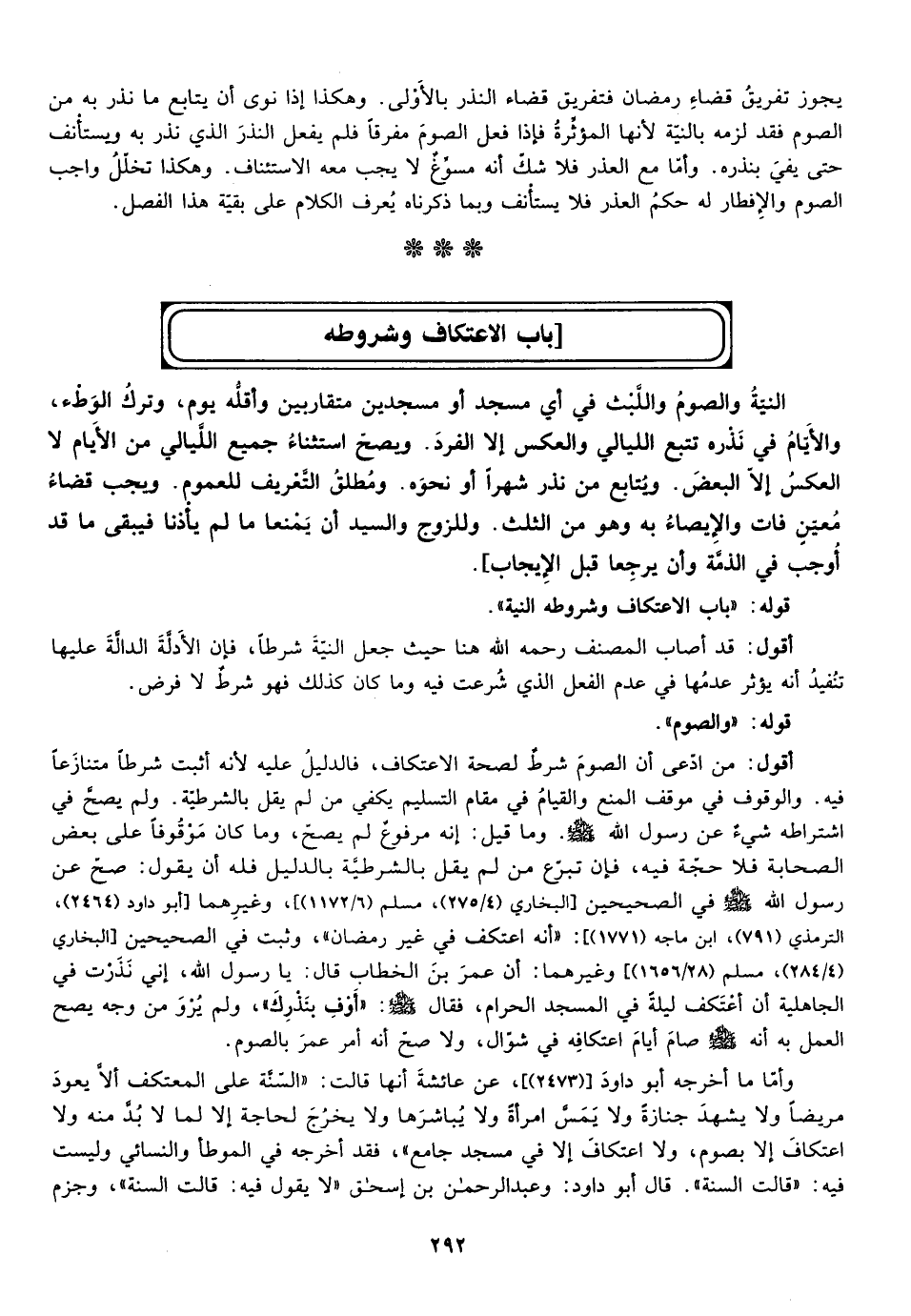 أقول: من ادعى ان الصوم شرط لصحة الاعتكاف فالدليل عليه لانه اثبت شرطا متنازعا فيه والوقوف في موقف المنع والقيام في مقام عدم التسليم يكفي من لم يقل بالشرطية ولم يصح في اشتراطه شيء عن رسول الله صلى الله عليه وسلم وما قيل انه مرفوع لم يصح وما كان موقوفا على بعض الصحابة فلا حجة فيه فإن تبرع من لم يقل بالشرطية بالدليل فله ان يقول صح عن رسول الله صلى الله عليه وسلم في الصحيحين وغيرهما انه اعتكف في غير رمضان وثبت في الصحيحين وغيرهما ان عمر بن الخطاب قال يا رسول الله اني نذرت في الجأهلية ان اعتكف ليلة في المسجد الحرام فقال صلى الله عليه وسلم: "أوف بنذرك"، ولم يرو من وجه صحيح يصح العمل به انه صلى الله عليه وسلم صام ايام اعتكافه في شوال ولا صح انه أمر عمر بالصوم.