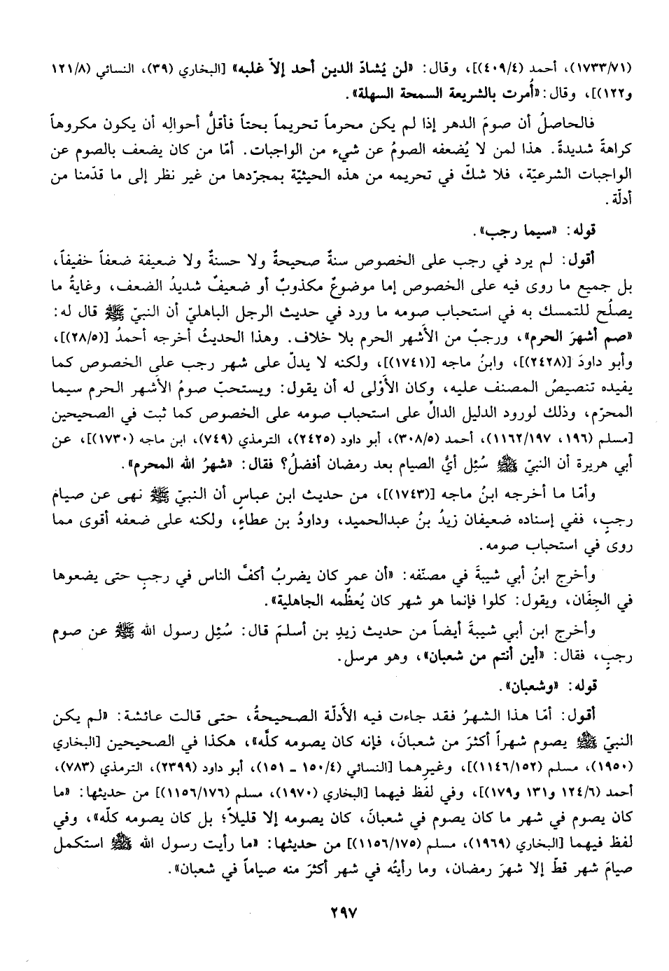 أقول: لم يرد في رجب على الخصوص سنة صحيحية ولا حسنة ولا ضعيفة ضعفا خفيفا بل جميع ما روى فيه على الخصوص أما موضوع مكذوب أو ضعيف شديد الضعف وغاية ما يصلح للتمسك به في استحباب صومه ما ورد في حديث الرجل البأهلي ان النبي صلى الله عليه وسلم قال له: "صم أشهر الحرم" ورجب من الاشهر الحرم بلا خلاف وهذا الحديث أخرجه أحمد وابو دأود وابن ماجه ولكنه لا يدل على شهر رجب على الخصوص كما يفيد تنصيص المصنف وكان الأولى له ان يقول ويستحب صوم الاشهر الحرم سيما المحرم وذلك لورود الدليل الدال على استحباب صومه على الخصوص كما ثبت في الصحيحين عن أبي هريرة ان النبي صلى الله عليه وسلم سئل أي الصيام بعد رمضان افضل فقال: "شهر الله المحرم".