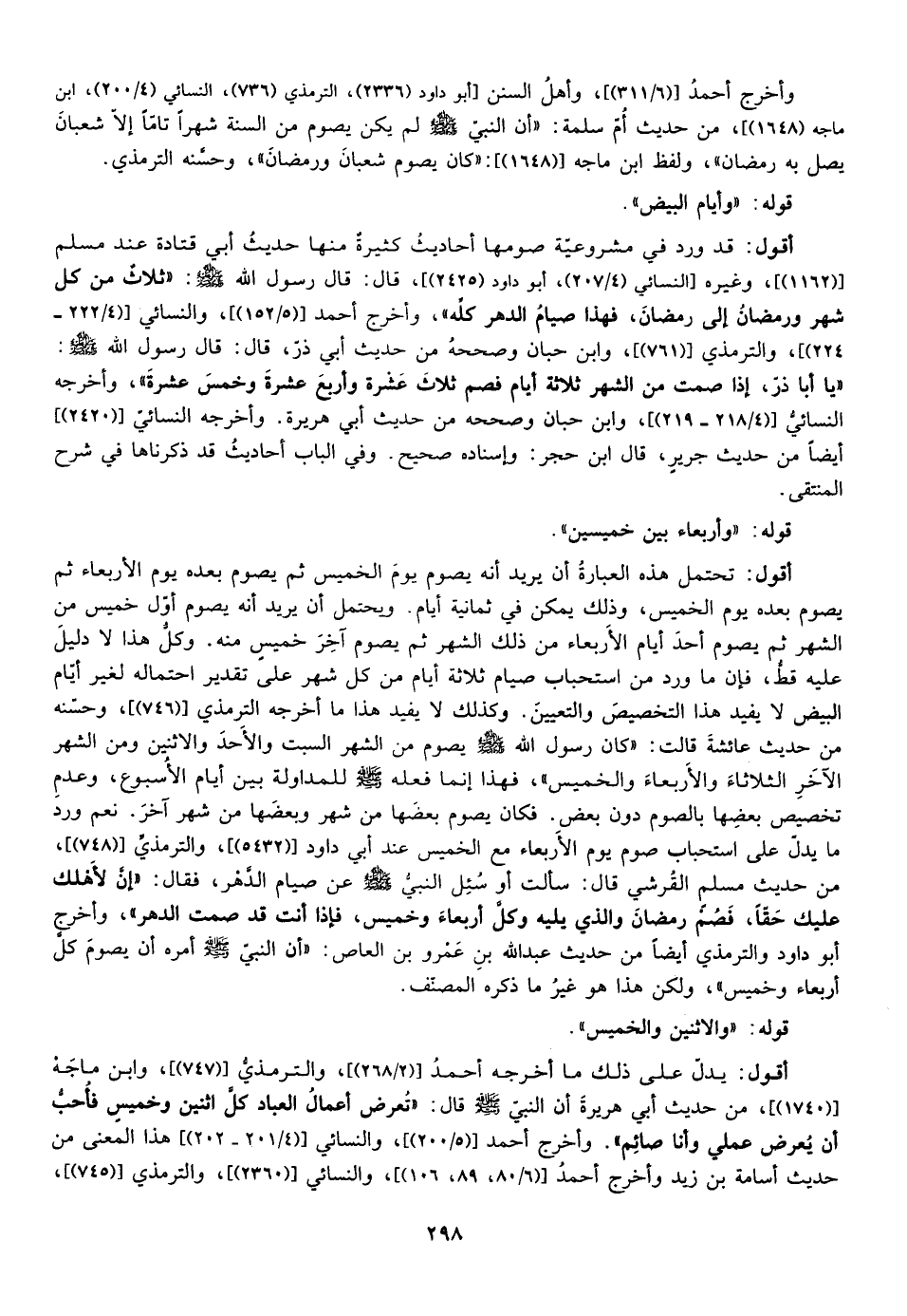 أقول: تحتمل هذه العبادة ان يريد انه يصوم يوم الخمس ثم يصوم بعده يوم الاربعاء ثم يصوم بعده يوم الخميس وذلك يمكن في ثمانية ايام ويحتمل ان يريد انه يصوم أول خميس من الشهر ثم يصوم أحد ايام الاربعاء من ذلك الشهر ثم يصوم آخر خميس منه وكل هذا لا دليل عليه قط فإن ما ورد من استحباب صيام ثلاثة أيام من كل شهر على تقدير احتماله لغير ايام البيض لا يفيد هذا التخصيص والتعيين وكذلك لا يفيد هذا ما أخرجه الترمذي وحسنه من حديث عائشة قالت كان رسول الله صلى الله عليه وسلم يصوم من الشهر السبت والاحد والاثنين ومن الشهر الاخر الثلاثاء والاربعاء والخميس فإن هذا إنما فعله صلى الله عليه وسلم للمدأولة بين ايام الاسبوع وعدم تخصيص بعضها بالصوم دون بعض فكان يصوم بعضها من شهر وبعضها من شهر آخر نعم ورد ما يدل على استحباب صوم الاربعاء مع الخميس عند أبي دأود والترمذي من حديث مسلم القرشي قال: سألت أو سئل النبي صلى الله عليه وسلم عن صيام الدهر فقال: "إن لأهلك عليك حقا فصم رمضان والذي يليه وكل اربعاء وخميس فإذا انت قد صمت الدهر" وأخرج أبو دأود والترمذي أيضا من حديث عبد الله بن عمر بن العاص ان النبي صلى الله عليه وسلم امره ان يصوم كل اربع وخميس ولكن هذا هو غير ما ذكره المصنف.