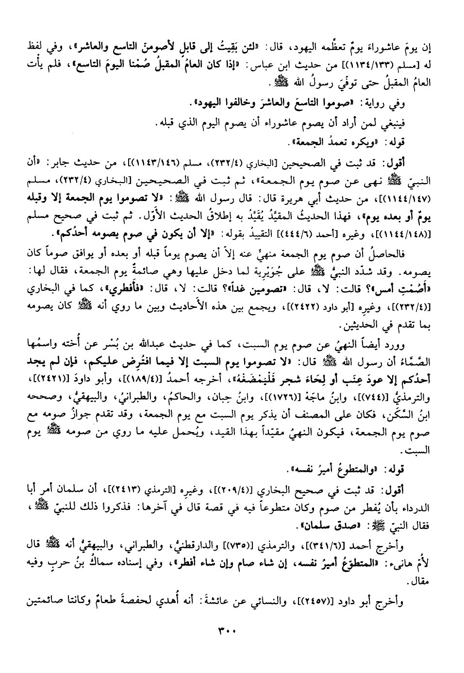 أقول: قد ثبت في الصحيحين من حديث جابر ان النبي صلى الله عليه وسلم نهى عن صوم يوم الجمعة ثم ثبت في الصحيحين من حديث أبي هريرة قال قال رسول الله صلى الله عليه وسلم: "لا تصوموا يوم الجمعة الا وقبله يوم أو بعده يوم"، فهذا الحديث المقيد يقيد به إطلاق الحديث الأول ثم ثبت في صحيح مسلم وغيره التقييد بقوله: "إلا أن يكون في صوم يصومه أحدكم"