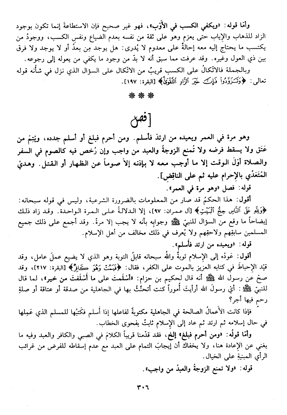 وأما قوله: "ويكفي الكسب في الأوب" فهو غير صحيح فإن الاستطاعة إنما تكون بوجود الزاد للذهاب والاياب حتى يعزم وهو على ثقة من نفسه بعدم الضياع ونفس الكسب ووجود من يكتسب ما يحتاج اليه معه إحالة على معدوم لا يدرى هل يوجد من بعد أولا يوجد ولا فرق بين ذي العول وغيره وقد عرفت مما سبق انه لا بد من وجود ما يكفي من يعوله إلي رجوعه وبالجملة فالاتكال على الكسب قريب من الاتكال على السؤال الذي نزل في شأنه قوله تعالي: {وَتَزَوَّدُوا فَإِنَّ خَيْرَ الزَّادِ التَّقْوَى} [البقرة: 197] .