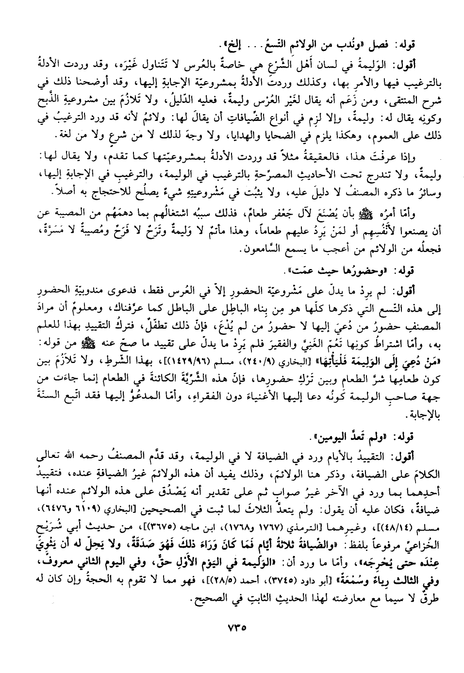 أقول: التقييد بالأيام ورد في الضيافة لا في الوليمة وقد قدم المصنف رحمه الله الكلام على الضيافة وذكر هنا الولائم وذلك يفيد أن هذه الولائم غير الضيافة عنده فتقييد أحدهما بما ورد في الآخر غير صواب ثم على تقدير أنه يصدق على هذه الولائم عنده أنها ضيافة فكان عليه أن يقول ولم يتعد الثلاث لما ثبت في الصحيحين [البخاري "6109، 6476"، مسلم "14/48"] ، وغيرهما [الترمذي "1767، 1768"، ابن ماجة "3675"] ، من حديث ابن شريح الخزاعي مرفوعا بلفظ: "والضيافة ثلاثة أيام فما كان كان وراء ذلك فهو صدقة ولا يحل أن يثوى عنده حتى يحرجه" وأما ما ورد "أن الوليمة في اليوم الأول حق وفي اليوم الثاني معروف ومن الثالث رياء وسمعة"، [أبو داود "3745"، أحمد "5/28"، فهو مما لا تقوم به الحجة وإن كان له طرق لا سيما مع معارضته لهذا الحديث الثابت في الصحيح.