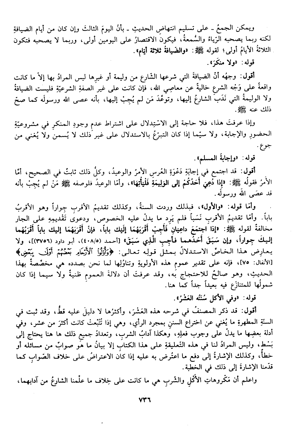 وإذا عرفت هذا فلا حاجة إلى الاستدلال على اشتراط عدم وجود المنكر في مشروعية الحضور والإجابة ولا سيما إذا كان التبرع بالاستدلال على ذلك لا يسمن ولايغني من جوع.