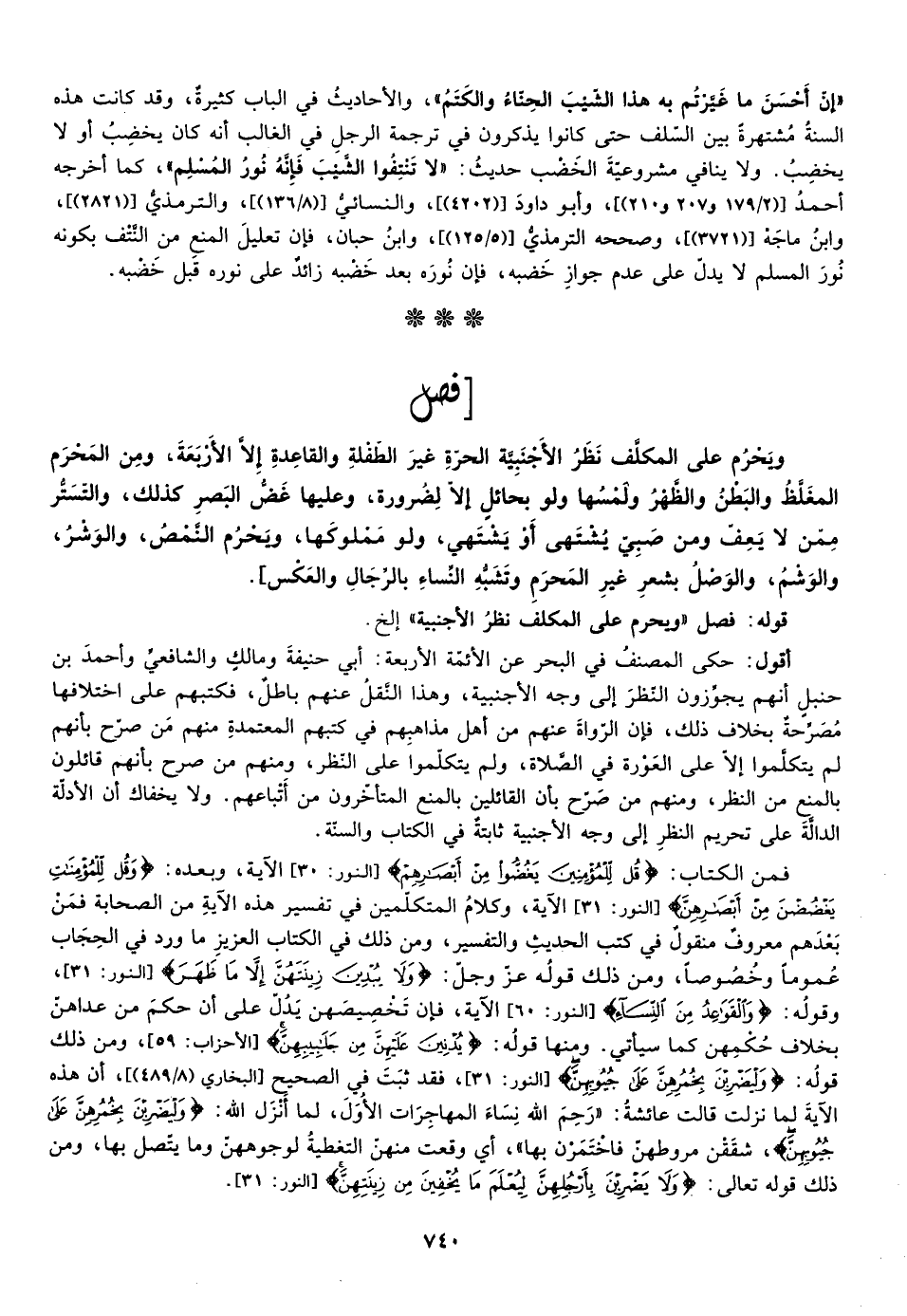 فمن الكتاب: {قُلْ لِلْمُؤْمِنِينَ يَغُضُّوا مِنْ أَبْصَارِهِمْ} [النور: 30] ، الآية وبعده {وَقُلْ لِلْمُؤْمِنَاتِ يَغْضُضْنَ مِنْ أَبْصَارِهِنَّ} [النور: 31] ، الآية وكلام المتكلمين في تفسير هذه الآية من الصحابة فمن بعدهم معروف منقول في كتب الحديث والتفسير ومن ذلك في الكتاب العزيز ما ورد في الحجاب عموما وخصوصا ومن ذلك قوله عزوجل: {وَلا يُبْدِينَ زِينَتَهُنَّ إِلَّا مَا ظَهَرَ مِنْهَا} [النور: 31] ، وقوله: {وَالْقَوَاعِدُ مِنَ النِّسَاءِ} [النور: 60] ، الآية فإن تخصيصهن يدل على أن حكم من عداهن بخلاف حكمهن كما سيأتي ومنها قوله: {يُدْنِينَ عَلَيْهِنَّ مِنْ جَلابِيبِهِنَّ} [الأحزاب: 59] ، ومن ذلك قوله: {وَلْيَضْرِبْنَ بِخُمُرِهِنَّ عَلَى جُيُوبِهِنَّ} [فقد ثبت في الصحيح أن هذه الآية لما نزلت قالت عائشة رحم الله نساء المهاجرات الأول لما أنزل الله وليضربن بخمرهم على جيوبهن شققن مروطهم فاختمرن بها أي وقعت منهن التغطية لوجوههم وما يتصل بها ومن ذلك قوله تعالى: {وَلا يَضْرِبْنَ بِأَرْجُلِهِنَّ لِيُعْلَمَ مَا يُخْفِينَ مِنْ زِينَتِهِنَّ} [النور: 31] .