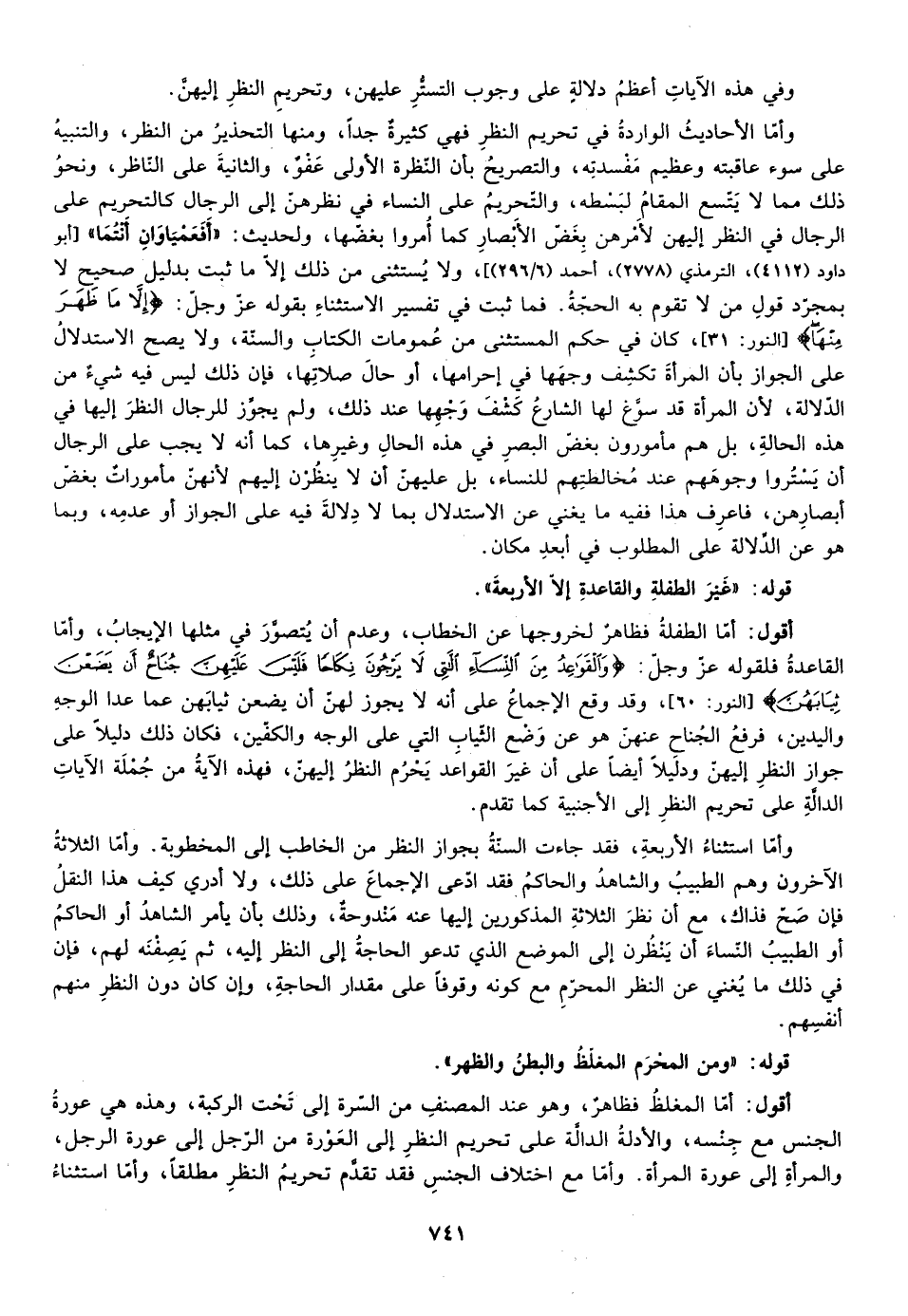 أقول: أما الطفلة فظاهر لخروجها عن الخطاب وعدم أن يتصور في مثلها الإيجاب وأما القاعدة فلقوله عزوجل: {وَالْقَوَاعِدُ مِنَ النِّسَاءِ اللَّاتِي لا يَرْجُونَ نِكَاحاً فَلَيْسَ عَلَيْهِنَّ جُنَاحٌ أَنْ يَضَعْنَ ثِيَابَهُنَّ} [النور: 60] ، وقد وقع الإجماع على أنه لا يجوز لهن أن يضعن ثيابهن عما عدا الوجه واليدين فرفع الجناح عنهن هو عن وضع الثياب التي على الوجه والكفين فكان ذلك دليلا على جواز النظر إليهم ودليلا أيضا على أن غير القواعد يحرم النظر إليهن فهذه الآية من جملة الآيات الدالة على تحريم النظر إلى الأجنبية كما تقدم.