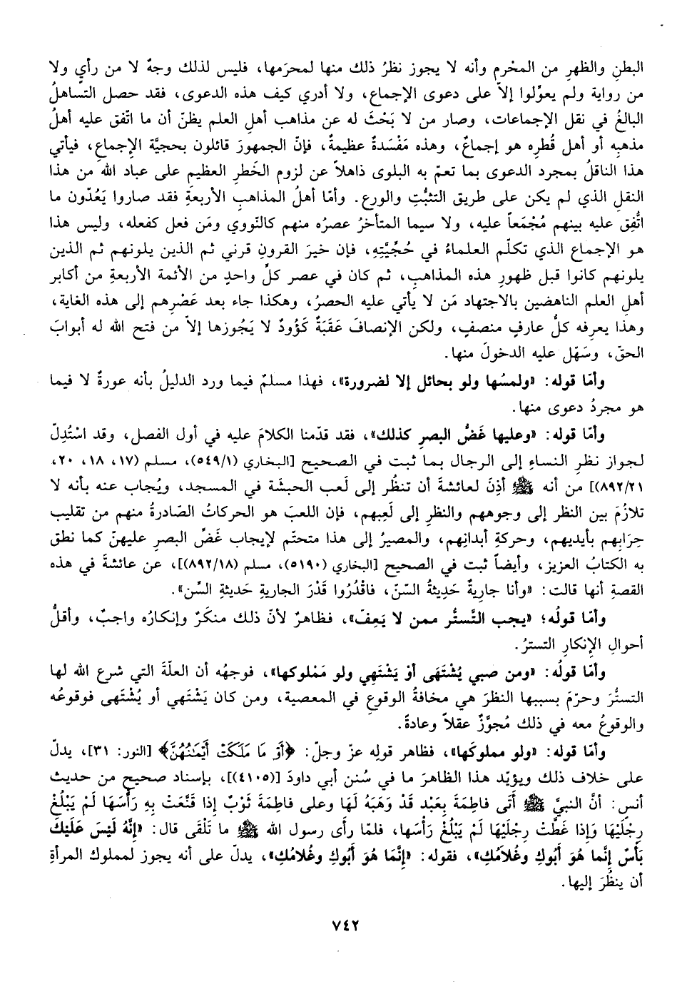 البطن والظهر من المحرم وأنه لا يجوز نظر ذلك منها لمحرمها فليس لذلك وجه لا من رأي ولا من رواية ولم يعولوا إلا على دعوى الإجماع ولا أدري كيف هذه الدعوى فقد حصل التساهل البالغ في نقل الإجماعات وصار من لا بحث له عن مذاهب أهل العلم يظن أن ما اتفق عليه أهل مذهبه وأهل قطره هو إجماع وهذه مفسدة عظيمة فإن الجمهور قائلون بحجية الإجماع فيأتي هذا الناقل بمجرد الدعوى بما نعم به البلوى ذاهلا عن لزوم الخطر العظيم على عباد الله من النقل الذي لم يكن على طريق التثبت والورع وأما أهل المذاهب الأربعة فقد صاروا يعدون ما اتفق عليه بينهم مجمعا عليه ولا سيما المتأخر عصره منهم كالنووي ومن فعل كفعله وليس هذا هو الإجماع الذي تكلم العلماء في حجيته فإن خير القرون ثم الذين يلونهم ثم الذين يلونهم كانوا قبل ظهور هذه المذاهب ثم كان في عصر كل واحد من الأئمة الأربعة من أكابر أهل العلم الناهضين بالاجتهاد من لا يأتي عليه الحصر وهكذا جاء بعد عصرهم إلى هذه الغاية وهذا يعرفه كل عارف منصف ولكن الإنصاف عقبة كئود لا يجوزها إلا من فتح الله له أبواب الحق وسهل عليه الدخول منها.