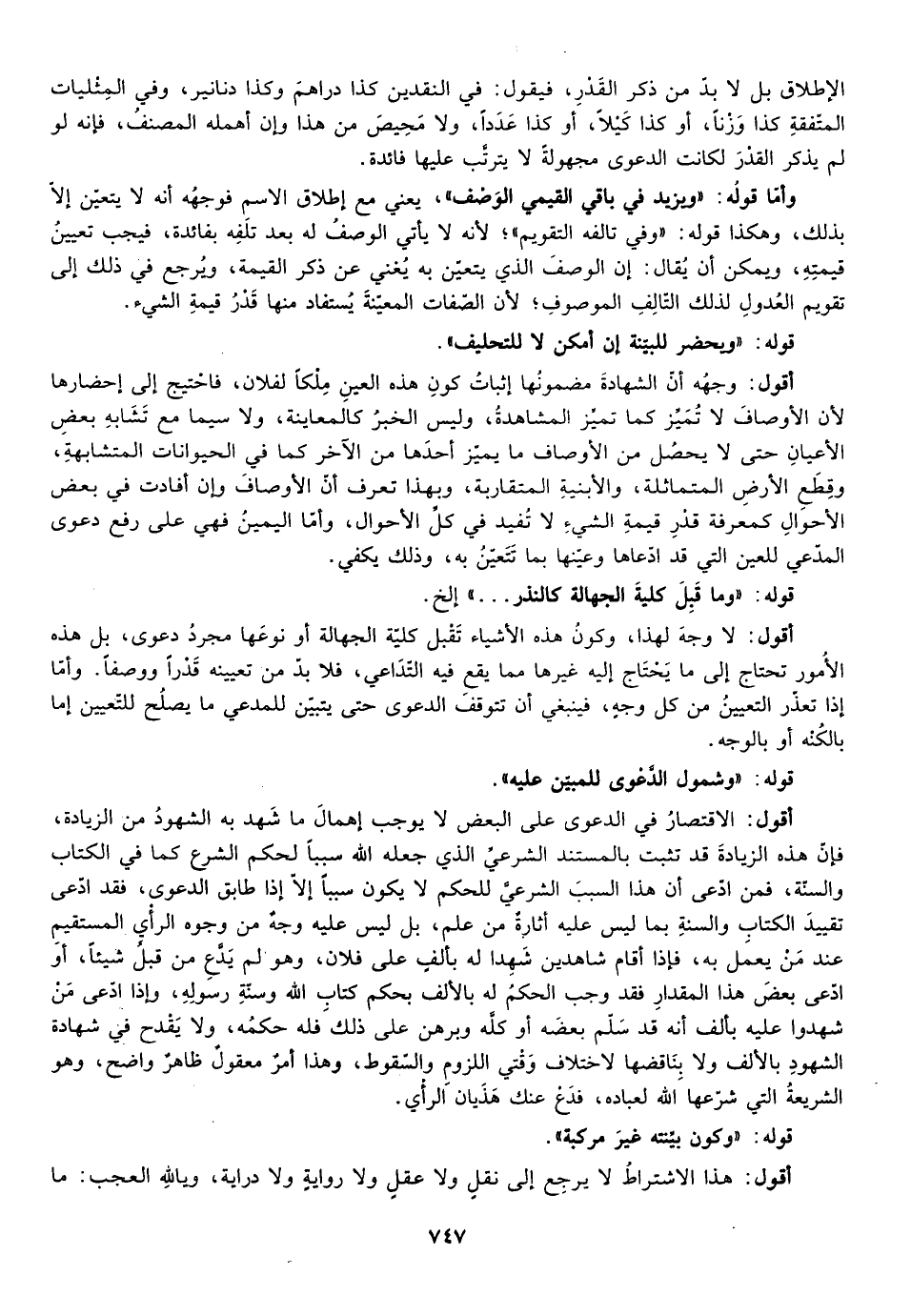 أقول: لا وجه لهذا وكون هذه الأشياء تقبل كلية الجهالة أو نوعها مجرد دعوى بل هذه الأمور تحتاج إلى ما يحتاج إليه غيرها مما يقع فيه التداعي فلا بد من تعيينه قدرا ووصفا وأما إذا تعذر التعيين من كل وجه فينبغي أن تتوقف الدعوى حتى يتبين للمدعي ما يصلح للتعيين إما بالكنه أو بالوجه.
