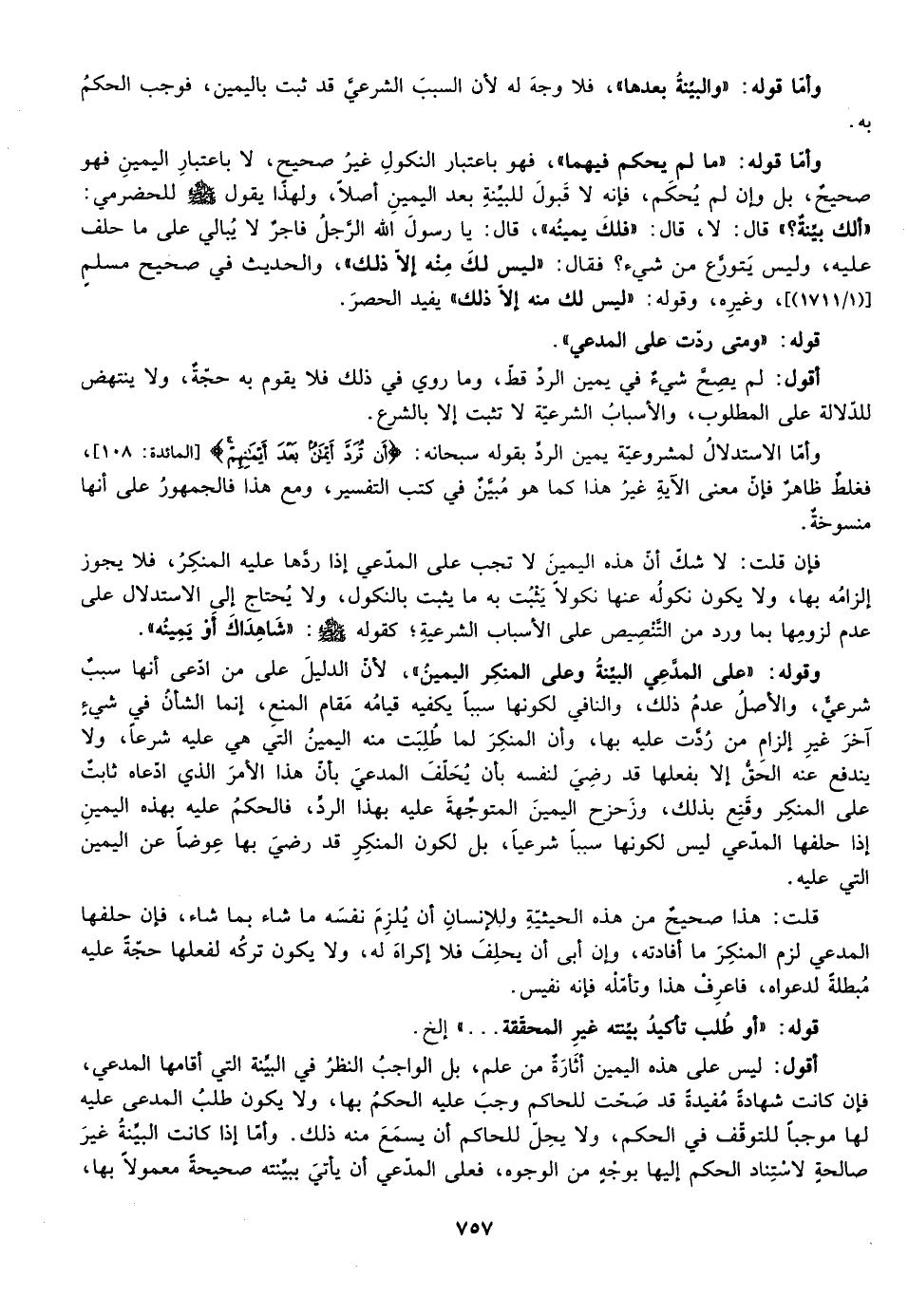فإن قلت: لا شك أن هذه اليمين لا تجب على المدعي إذا ردها عليه المنكر فلا يجوز إلزامه بها ولا يكون نكوله عنها نكولا يثبت به ما ثبت بالنكول ولا يحتاج إلى الاستدلال على عدم لزومها بما ورد التنصيص على الأسباب الشرعيه كقوله صلى الله عليه وسلم: "شاهداك أو يمينه".