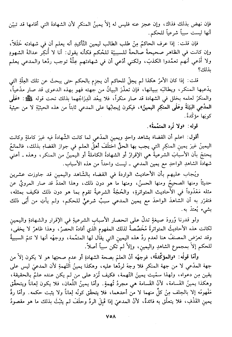 قلت إذا كان الأمر هكذا لم يحل للحاكم أن يجزم بالحكم حتى يبحث عن تلك العلة التي يدعيها المنكر ويطالبه ببيانها فإن تعذر البيان من جهته فهو بهذه الدعوى قد صار مدعيا والمنكر لعلمه بخلل في الشهادة قد صار منكرا فلا يبعد أندراجهما بذلك تحت قوله صلى الله عليه وسلم: "على المدعي البينة وعلى المنكر اليمين" فيكون إيجابها على المدعي ثابتا من هذه الحيثية لا من حيثية كونها مؤكدة.