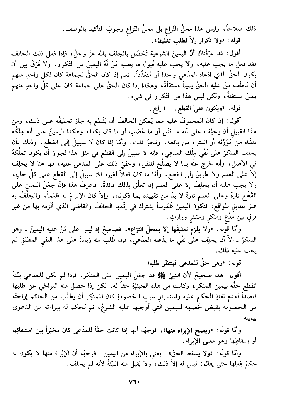 وأما قوله: "ولا يلزم تعليقها إلا بمحل النزاع" فصحيح إذ ليس على من عليه اليمين وهو المنكر إلا أن يحلف على نفي ما يدعيه المدعي فإن طلب منه زيادة على هذا النفي المطلق لم يجب عليه ذلك.