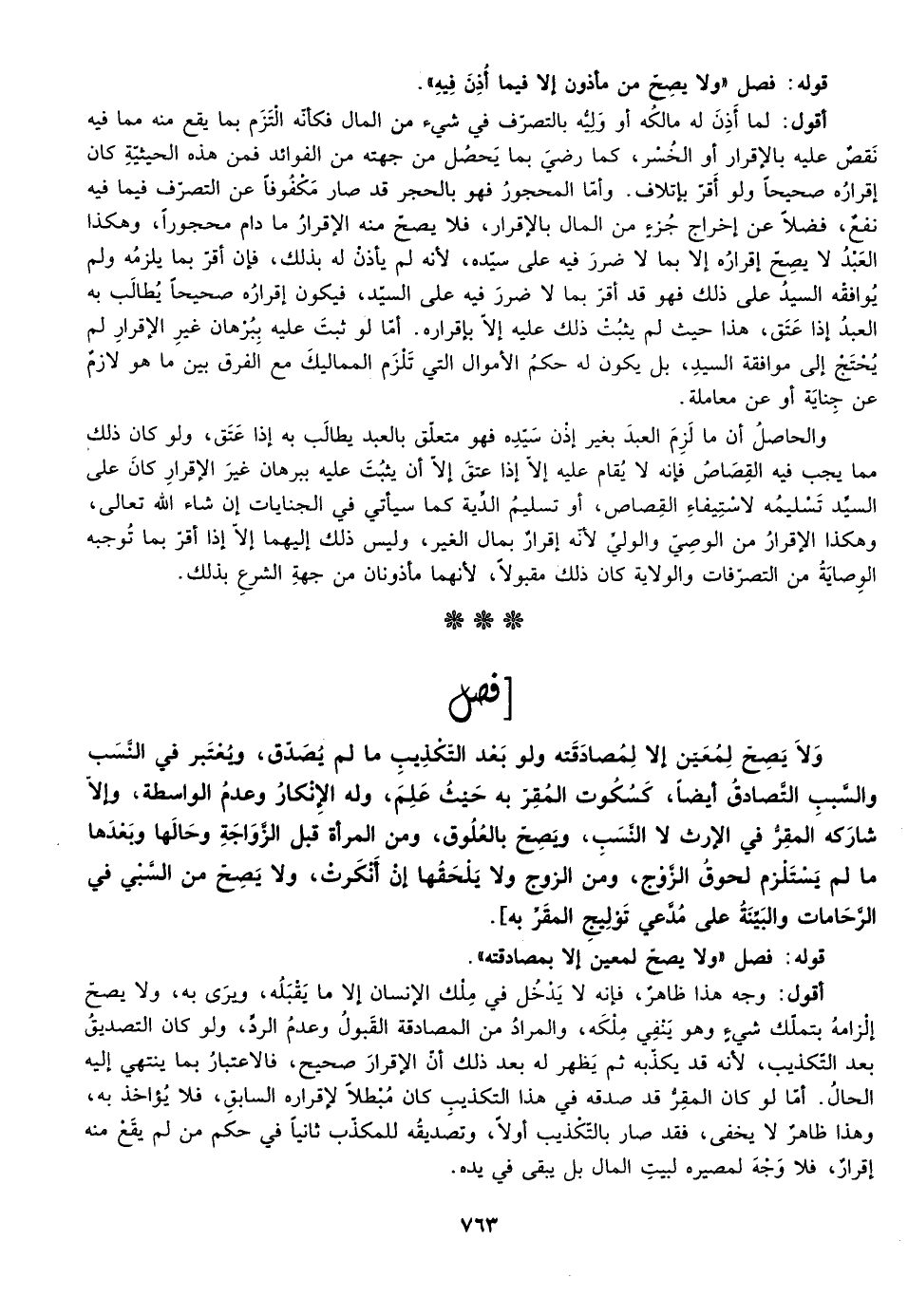 أقول: لما أذن له مالكه أو وليه بالتصرف في شيء من المال فكأنه التزم بما يقع منه مما فيه نقص عليه بالإقرار أو الخسر كما رضي بما يحصل من جهته من الفوائد فمن هذه الحيثية كان إقراره صحيحا ولو أقر بإتلاف وأما المحجور فهو بالحجر قد صار مكفوفا عن التصرف فيما فيه نفع فضلا عن إخراج جزء من المال بالإقرار فلا يصح منه الإقرار ما دام محجورا وهكذا العبد لا يصح إقراره إلا بما لا ضرر فيه على سيده لأنه لم يأذن له بذلك فإن أقر بما يلزمه ولم يوافقه السيد على ذلك فهو قد أقر بما لا ضرر فيه على السيد فيكون إقراره صحيحا يطالب به العبد إذا عتق هذا حيث لم يثبت ذلك عليه إلا بإقراره أما لو ثبت عليه ببرهان غير الإقرار لم يحتج إلى موافقة السيد بل يكون له حكم الأموال التي تلزم المماليك مع الفرق بين ما هو لازم عن جناية أو عن معاملة.