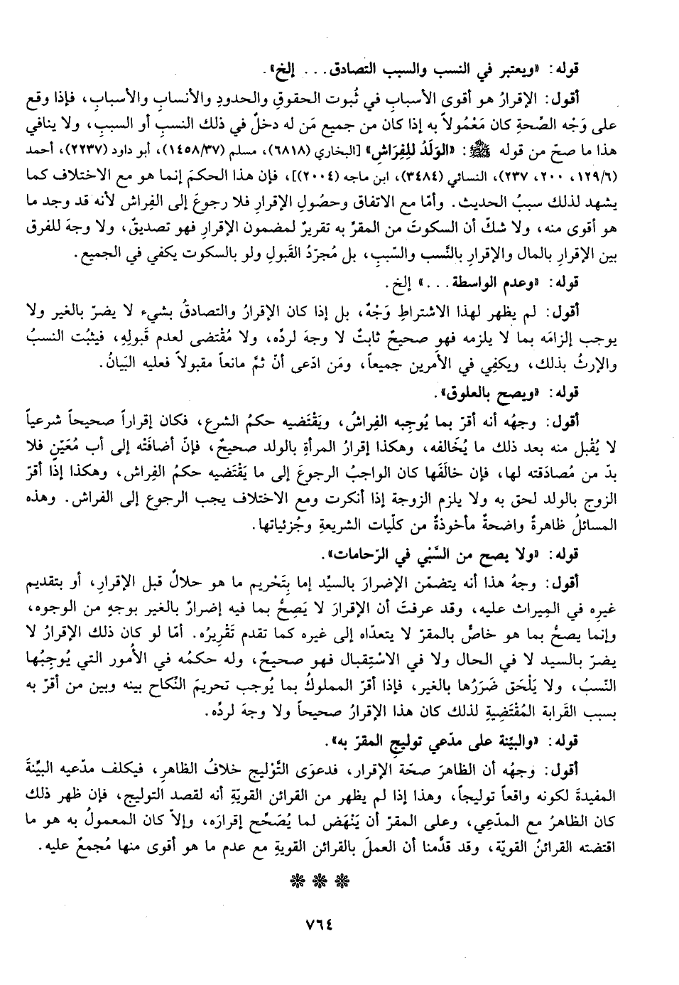 أقول: الإقرار هو أقوى الأسباب في ثبوت الحقوق والحدود والأنساب والأسباب فإذا وقع على وجه الصحة كان معمولا به إذا كان من جميع من له دخل في ذلك النسب أو السبب ولا ينافي هذا ما صح من قوله صلى الله عليه وسلم: "الولد للفراش"، [البخاري "6818"، مسلم "37/1458"، أبو داود "2237"، أحمد "6/129، 200، 237"، النسائي "3484"، ابن ماجة "2004"] ، فإن هذا الحكم إنما هو مع الاختلاف كما شهد لذلك سبب الحديث وأما مع الاتفاق وحصول الإقرار فلا رجوع إلى الفراش لأنه قد وجد ما هو أقوى منه ولا شك أن السكوت من المقربة تقرير لمضمون الإقرار فهو تصديق ولا وجه للفرق بين الإقرار بالمال والإقرار بالنسب والسبب بل مجرد القبول ولو بالسكوت يكفي في الجميع.