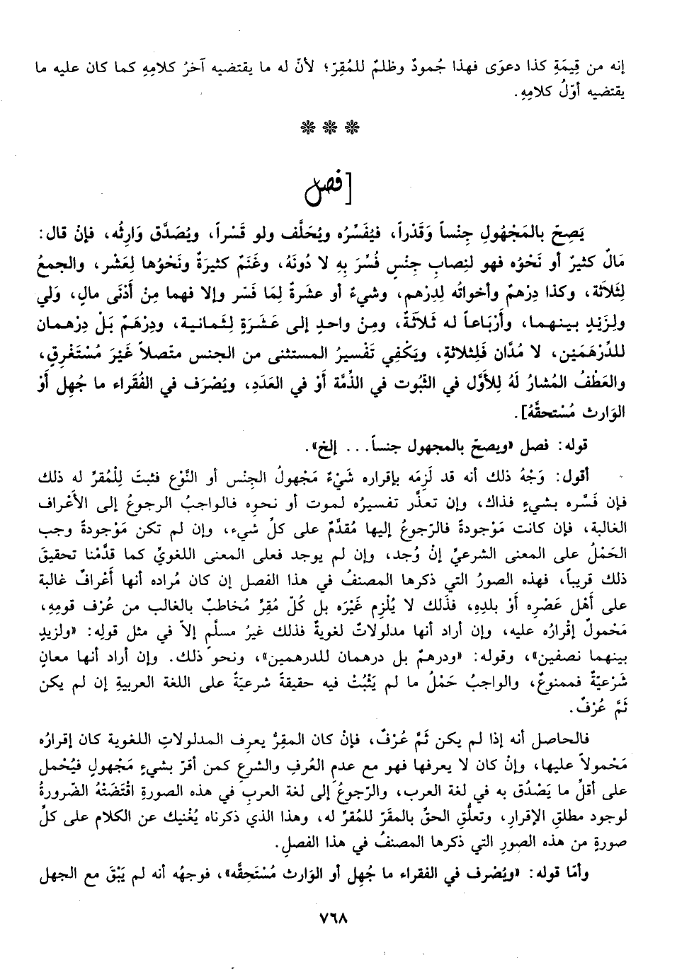 ويصح بالمجهول جنسا وقدرا فيفسره ويحلف ولو قسرا ويصدق وارثه فإن قال مال كثير أو نحوه فهو لنصاب جنس فسر به لا دونه وغنم كثيرة ونحوها لعشر والجمع لثلاثة وكذا درهم وأخواته لدرهم وشيء أو عشرة لما فسر إلا فهما من أدنى مال ولي ولزيد بينهما وأرباعا له ثلاثة ومن واحد إلى عشرة لثمانية ودرهم بل درهمان للدرهمين لا مدان فلثلاثة ويكفي تفسير المستثنى من الجنس متصلا غير مستغرق والعطف المشار له للأول في الثبوت في الذمة أو في العدد ويصرف في الفقراء ما جهل أو الوارث مستحقه] .