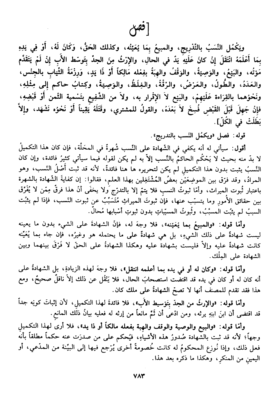 أقول: سيأتي له أنه يكفي في الشهادة على النسب شهرة في المحلة فإن كان هذا التكميل لا بد منه بحيث لا يحكم الحاكم بالنسب إلا به لم يكن لقوله فيما سيأتي كثير فائدة وإن كان النسب يثبت بدون هذا التكميل لم يكن لتحريره ها هنا فائدة لأنه قد ثبت أصل النسب وهو المراد وقد فرق بين الموضعين بعض المشتغلين بهذا العلم فقالوا إن كفاية الشهادة بالشهرة باعتبار ثبوت الميراث وأما ثبوت النسب فلا يتم إلا بالتدرج ولا يخفى أن هذا فرق ممن لا يفرق بين حقائق الأمور وما يتسبب عنها فإن ثبوت الميراث متسبب عن ثبوت النسب فإذا لم يثبت السبب لم يثبت المسبب وثبوت المسببات بدون ثبوت أسبابها محال.