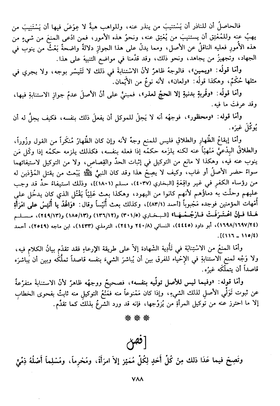 وأما إيقاع الظهار والطلاق فليس للمنع وجه وإن كان الظهار منكرا من القول وزورا والطلاق البدعي منهيا عنه لكنه يلزمه حكمه إذا فعله بنفسه فكذلك يلزمه حكمه إذا وكل من ينوب عنه فيه وهكذا لا مانع من التوكيل في إثبات الحد والقصاص ولا من التوكيل لاستيفائها سواء حضر الأصل أو غاب وكيف لا يصح هذا وقد كان النبي صلى الله عليه وسلم يبعث من يقتل المؤذين له من رؤساء الكفر في غير واقعة [البخاري "4037"، مسلم "1801"ي، وذلك استيفاء حد قد وجب عليهم وحلت به دماؤهم لأنهم كانوا من اليهود وهكذا بعث عليا يقتل الذي كان يدخ ل على أمهات المؤمنين فوجده مجبوبا وكذلك بعث أنيسا فقال: "واغد يا أنيس على امرأة هذا فإن اعترفت فارجمها"، [البخاري "5/301، 12/136، 13/185، 13/249"، مسلم "24/1697، 1698"، أبو داود "4445"، النسائي "8/240، 241"، الترمذي "1433"، ابن ماجة "2549"، أحمد "4/115، 116"] .