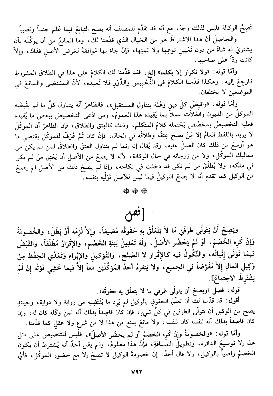 وأما قوله: "والخصومة وإن كره الخصم أو لم يحضر الأصل" فليس للتنصيص على مثل هذا إلا توسيع الدائرة وتطويل المسافة فإن هذا معلوم ولم يقل أحد أنه يشترط أن يكون الخصم راضيا بالوكيل ولا قال أحد إن خصومة الوكيل لا تصح إلا مع حضور الموكل فأي