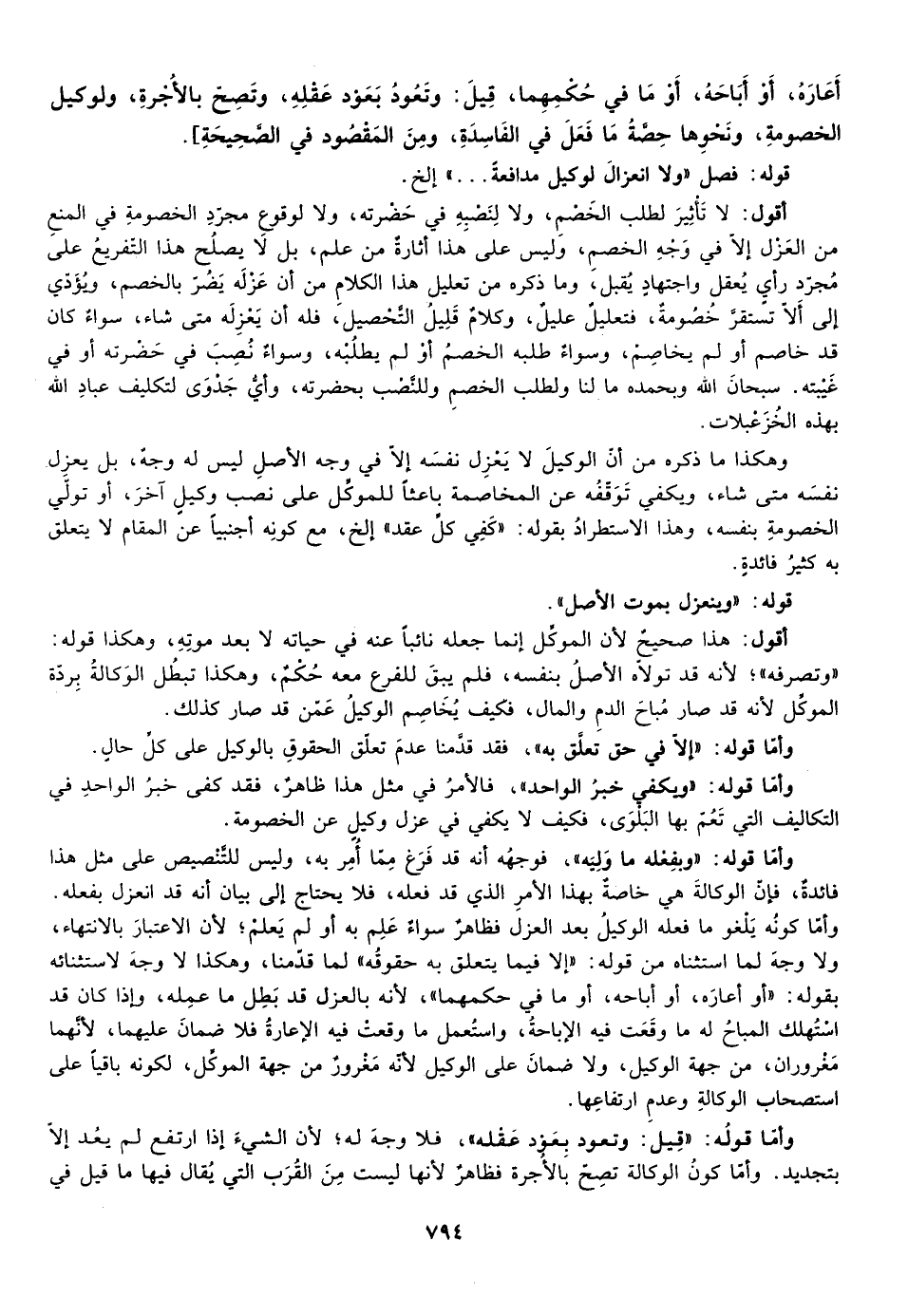 وهكذا ما ذكره من أن الوكيل لا يعزل نفسه إلا في وجه الأصل ليس له وجه بل يعزل نفسه متى شاء ويكفي توقفه عن المخاصمة باعثا للموكل على نصب وكيل آخر أو تولي الخصومة بنفسه وهذا الاستطراد بقوله كفي كل عقد إلخ مع كونه أجنبيا عن المقام لا يتعلق به كثير فائدة.
