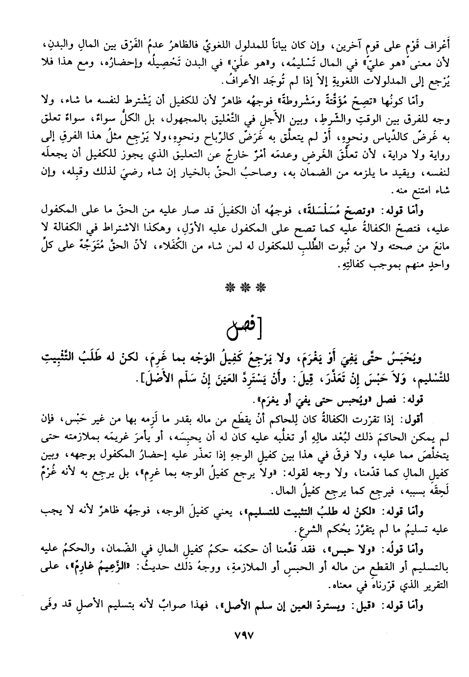 أقول: إذا تقررت الكفالة كان للحاكم أن يقطع من ماله بقدر ما لزمه من غير حبس فإن لم يمكن الحاكم ذلك لبعد ماله أو تغلبه عليه كان له أن يحبسه أو يأمر غريمه بملازمته حتى يتخلص مما عليه ولا فرق في هذا بين كفيل الوجه إذا تعذر عليه إحضار المكفول بوجهه وبين كفيل المال كما قدمنا ولا وجه لقوله ولا يرجع كفيل الوجه بما غرم بل يرجع به لأنه غرم لحقه بسببه فيرجع كما يرجع كفيل المال.