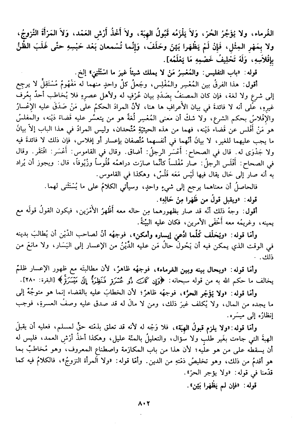 أقول: هذا الفرق بين المعسر والمفلس وجعل كل واحد منهما له مفهوم مستقل لا يرجع إلى شرع ولا لغة فإن كان المصنف بصدد بيان عرف له ولأهل عصره فلا يخاطب أحد بعرف غيره على أنه لا فائدة في بيان الأعراف ها هنا لأن المراد الحكم على من صدق عليه الإعسار والإفلاس بحكم الشرع ولا شك أن معنى المعسر لغة هو من يتعسر عليه قضاء دينه والمفلس هو من أفلس عن قضاء دينه فهما من هذه الحيثية متحدان وليس المراد من هذا الباب إلا بيان ما يجب عليهما للغير لا بيان أنهما في أنفسهما متصفان بإعسار أو إفلاس فإن ذلك لا فائدة فيه ولا جدوى له قال في الصحاح أعسر الرجل أضاق وقال من القاموس أعسر افتقر وقال في الصحاح أفلس الرجل صار مفلسا كأنما صارت دراهمه فلوسه وزيوفا قال ويجوز أن يراد به أنه صار إلى حال يقال فيها ليس معه فلس وهكذا في القاموس.