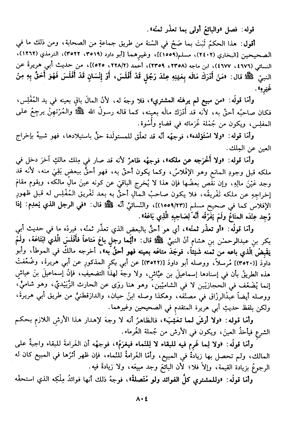وأما قوله: "أو تعذر ثمنه" أي هو أحق بالبعض الذي تعذر ثمنه فيرده ما في حديث أبي بكر بن عبد الرحمن بن هشام أن النبي صلى الله عليه وسلم قال: "أيما رجل باع متاعا فأفلس الذي ابتاعه ولم يقبض الذي باعه من ثمنه شيئا فوجد متاعه بعينة فهو أحق به"، أخرجه مالك في الموطأ وأبو داود "3520"، مرسلا ووصله أبو داود "3522"، عن أبي بكر المذكور عن أبي هريرة وضعفت هذه الطريق بأن في إسنادها إسماعيل بن عياش ولا وجه لهذا التضعيف فإن إسماعيل بن عياش إنما يضعف في الحجازيين لا في الشاميين وهو هنا روى عن الحارث الزبيدي وهو شامي ووصله أيضا عبد الرزاق في مصنفه وهكذا وصله ابن حبان والدارقطني من طريق أبي هريرة ولكن بلفظ حديث أبي هريرة المتقدم في الصحيحين وغيرهما.