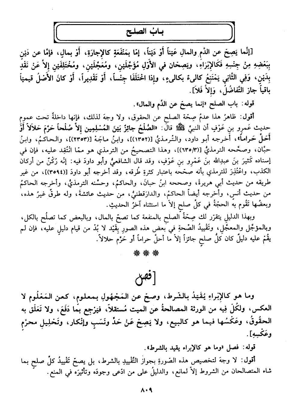 أقول: ظاهر هذا عدم صحة الصلح عن الحقوق ولا وجه لذلك فإنها داخلة تحت عموم حديث عمرو بن عوف أن النبي صلى الله عليه وسلم قال: "الصلح جائز بين المسلمين إلا صلحا حرم حلالا أو أحل حراما"، أخرجه أبو داود والترمذي ["1352"ـ ابن ماجة "2353"] ، والحاكم وابن حبان وصححه الترمذي "3/635"، وهذا التصحيح من الترمذي هو مما انتقد عليه فإن في إسناده كثير بن عبد الله بن عمرو بن عوف وقد قال الشافعي وأبو داود فيه إنه ركن من أركان الكذب واعتذر للترمذي بأنه صححه باعتبار كثرة طرقه وقد أخرجه أبو داود "3594"، من غير طريقه من حديث أبي هريرة وصححه ابن حبان والحاكم وحسنه الترمذي وأخرجه الحاكم من حديث أنس وأخرجه أيضا الحاكم والدارقطني من حديث عائشة وله طرق غير هذه وبعضها تقوم به الحجة في كل صلح إلا ما استثناه آخر الحديث.