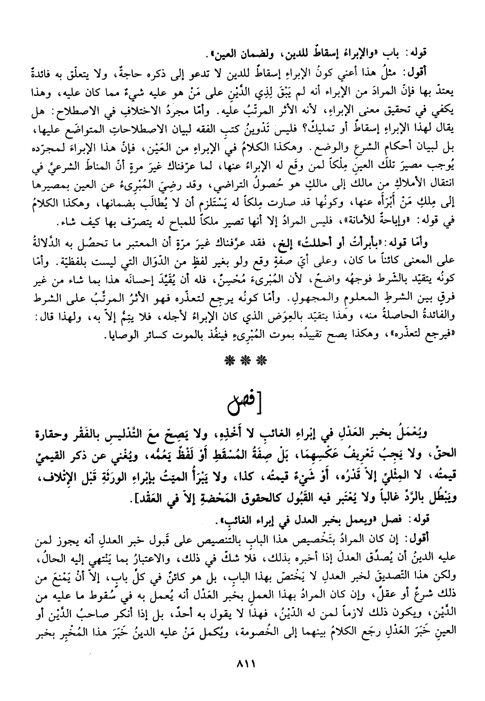 أقول: إن كان المراد بتخصيص هذا الباب بالتنصيص على قبول خبر العدل أنه يجوز لمن عليه الدين أن يصدق العدل إذا أخبره بذلك فلا شك في ذلك والاعتبار بما ينتهي إليه الحال ولكن هذا التصديق لخبر العدل لا يختص بهذا الباب بل هو بما ينتهي إليه الحال ولكن هذا التصديق لخبر العدل لا يختص بهذا الباب بل هو كائن في كل باب إلا أن يمنع من ذلك شرع أو عقل وإلا كان المراد بهذا العمل بخبر العدل أنه يعمل به في سقوط ما عليه من الدين ويكون ذلك لازما لمن له الدين فهذا لا يقول به أحد بل إذا أنكر صاحب الدين أو العين خبر العدل رجع الكلام بينهما إلى الخصومة ويكمل من عليه الدين خبر هذا المخبر بخبر