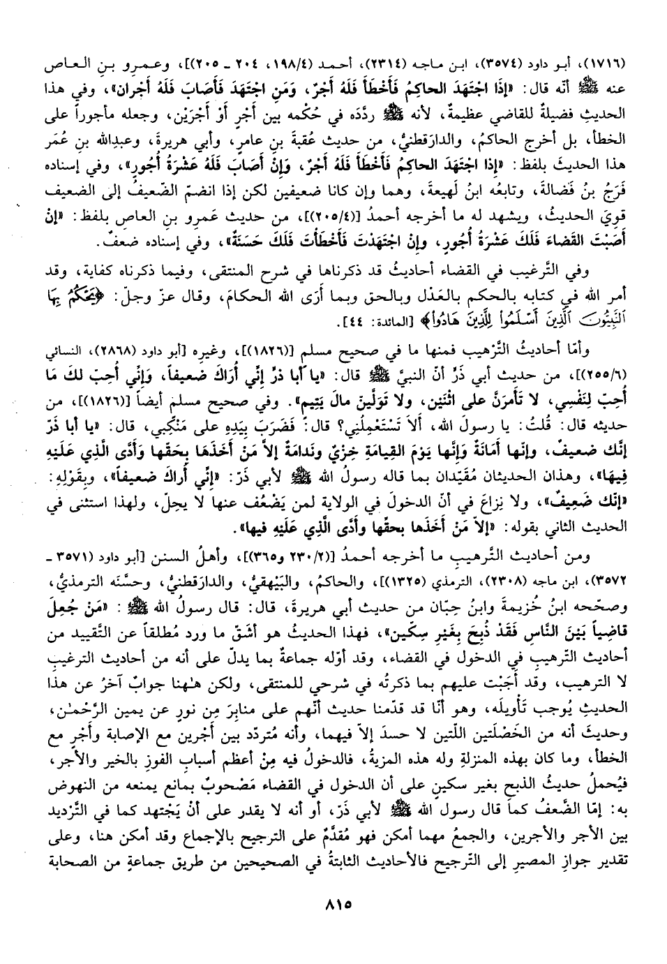 ومن أحاديث الترهيب ما أخرجه أحمد "2/230، 365"، وأهل السنن أبو داود "3571"، 3572"، ابن ماجة "2308"، الترمذي "1325"، والحاكم والبيهقي والدارقطني وحسنه الترمذي وصححه ابن خزيمة وابن حبان من حديث أبي هريرة قال: قال رسول الله صلى الله عليه وسلم: "من جعل قاضيا بين الناس فقد ذبح بغير سكين"، فهذا الحديث هو أشق ما ورد مطلقا عن التقييد من أحاديث الترهيب في الدخول في القضاء وقد أوله جماعة بما يدل على أنه من أحاديث الترغيب لا الترهيب وقد أجبت عنهم بما ذكرته في شرحي للمنتقى ولكن ها هنا جواب آخر عن هذا الحديث يوجب تأويله وهو أنا قد قدمنا حديث أنهم على منابر من نور عن يمين الرحمن وحديث أنه أحد الخصلتين اللتين لا حسد إلا فيهما وأنه متردد بين أجرين مع الإصابة وأجر مع الخطأ وما كان بهذه المنزلة وله هذه المزية فالدخول فيه من أعظم أسباب الفوز بالخير والأجر فيحمل حديث الذبح بغير سكين على أن الدخول في القضاء مصحوب بمانع يمنعه من النهوض به أما الضعف كما قال صلى الله عليه وسلم لأبي ذر وأنه لا يقدر على أن يجتهد كما في الترديد بين الأجر والأجرين والجمع مهما أمكن فهو مقدم على الترجيح بالإجماع وقد أمكن هنا وعلى تقدير جواز المصير إلى الترجيح فالأحاديث الثابتة في الصحيحين من طريق جماعة من الصحابة