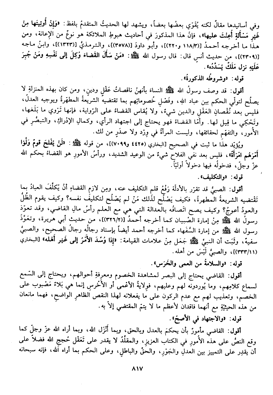 ويؤيد هذا ما ثبت في الصحيح [البخاري "4425، 7099"] ، من قوله صلى الله عليه وسلم: "لن يفلح قوم ولوا أمرهم امرأة" فليس بعد نفي الفلاح شيء من الوعيد الشديد ورأس الأمور هو القضاء بحكم الله عزوجل فدخوله فيها دخولا أوليا.