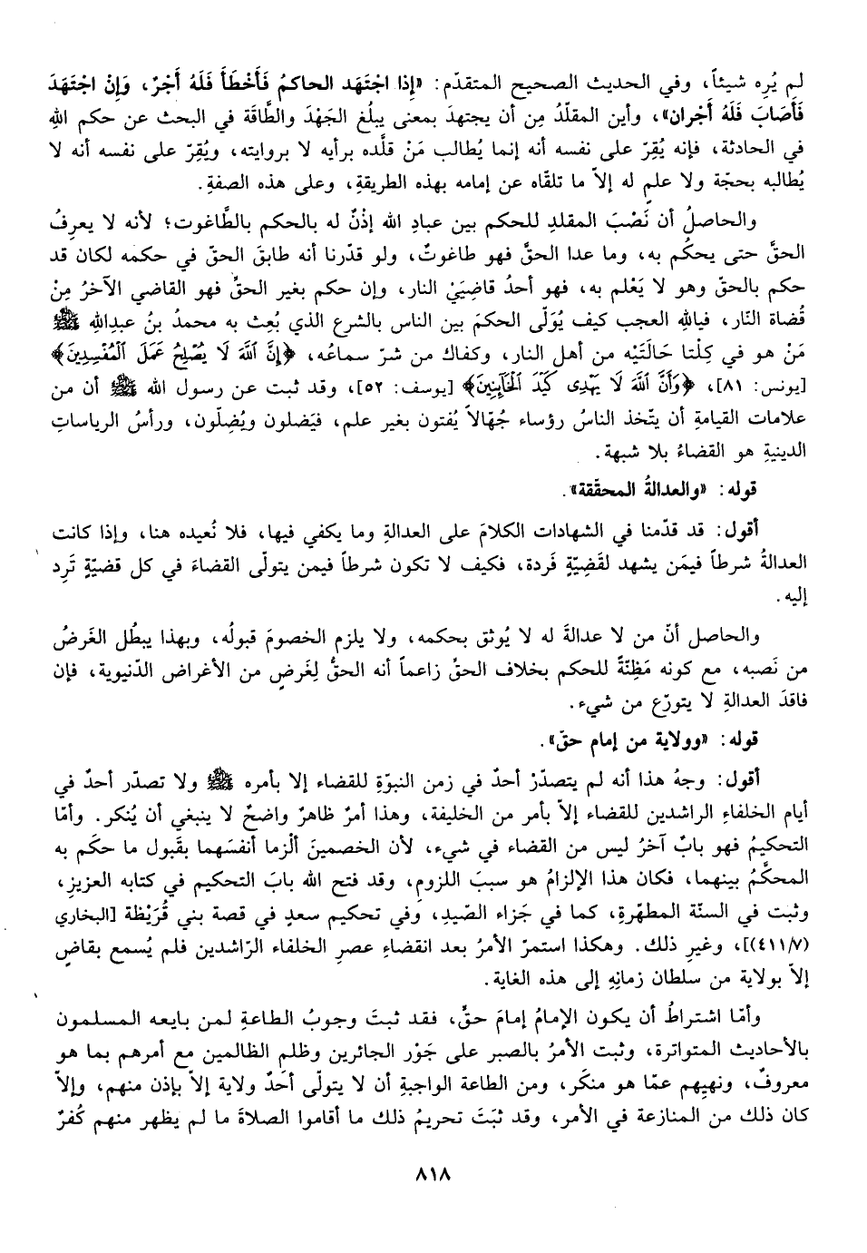 والحاصل أن نصب المقلد للحكم بين عباد الله إذن له بالحكم بالطاغوت لأنه لا يعرف الحق حتى يحكم به وما عدا الحق فهو طاغوت ولو قدرنا أنه طابق الحق في حكمه لكان قد حكم بالحق وهو لا يعلم به فهو أحد قاضي النار وإن حكم بغير الحق فهو القاضي الآخر من قضاة النار فيالله العجب كيف يولي الحكم بين الناس بالشرع الذي بعث به محمد بن عبد الله صلى الله عليه وسلم من هو في كلتا حالتيه من أهل النار وكفاك من شر سماعه {إِنَّ اللَّهَ لا يُصْلِحُ عَمَلَ الْمُفْسِدِينَ} [يونس: 81] ، {وَأَنَّ اللَّهَ لا يَهْدِي كَيْدَ الْخَائِنِينَ} [يوسف: 52] ، وقد ثبت عن رسول الله صلى الله عليه وسلم أن من علامات القيامة أن يتخذ الناس رؤساء جهالا يفتون بغير علم فيضلون ويضلون ورأس الرياسات الدينية هو القضاء بلا شبهة.