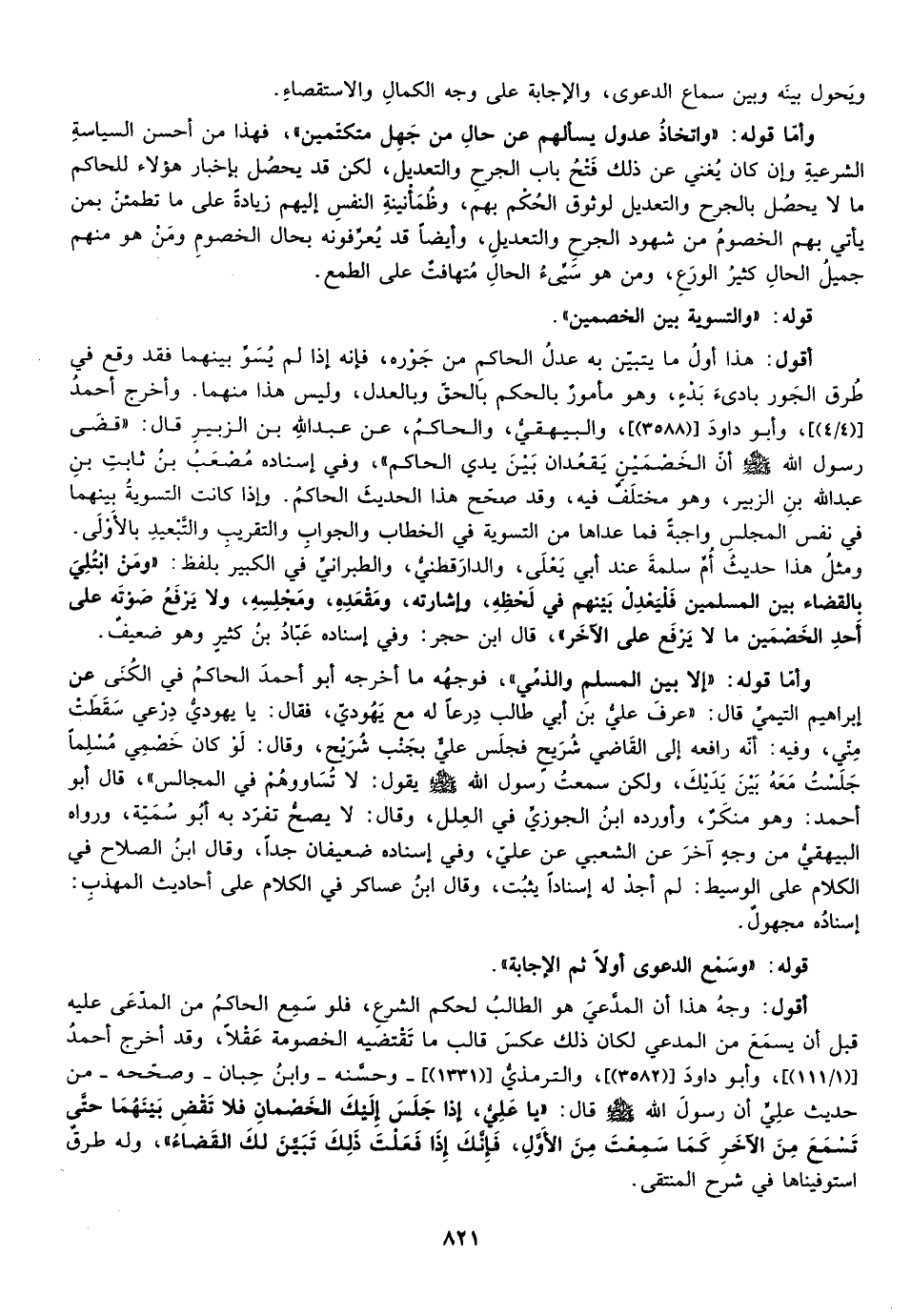 أقول: هذا أول ما يتبين به عدل الحاكم من جوره فإنه إذا لم يسو بينهما فقد وقع في طريق الجور باديء بدء وهو مأمور بالحكم بالحق وبالعدل وليس هذا منهما وأخرج أحمد "4/4"، وأبو داود "3588"، والبيهقي والحاكم عن عبد الله بن الزبير قال قضى رسول الله صلى الله عليه وسلم: "أن الخصمين يقعدان بين يدي الحاكم"، وفي إسناده مصعب بن ثابت بن عبد الله بن الزبير وهو مختلف فيه وقد صحح هذا الحديث الحاكم وإذا كانت التسوية بينهما في نفس المجلس واجبة فما عداها من التسوية في الخطاب والجواب والتقريب والتبعيد بالأولى ومثل هذا حديث أم سلمة عند أبي يعلى والدارقطني والطبراني في الكبير بلفظ: "ومن ابتلي بالقضاء بين المسلمين فليعدل بينهم في لحظه وإشارته ومقعده ومجلسه ولا يرفع صوته على أحد الخصمين ما لا يرفع على الآخر"، وفي إسناده عباد بن كثير وهو ضعيف.