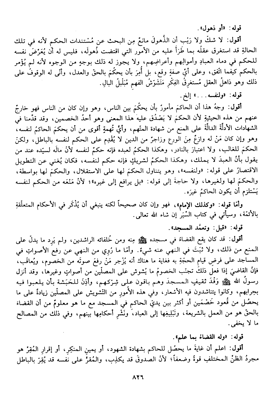 أقول: لا شك ولا ريب أن الذهول مانع من البحث عن مستندات الحكم لأنه في تلك الحالة قد استغرق عقله بما طرأ عليه من الأمور التي اقتضت ذهوله وليس له أن يعرض نفسه للحكم في دماء العباد وأموالهم وأعراضهم ولا يجوز له ذلك بوجه من الوجوه لأنه لم يؤمر بالحكم كيفما اتفق وعلى أي صفة وقع بل أمر بأن يحكم بالحق والعدل وأنى له الوقوف على ذلك وهو ذاهل العقل مستغرق الفكر متشوش الفهم مبلبل البال.