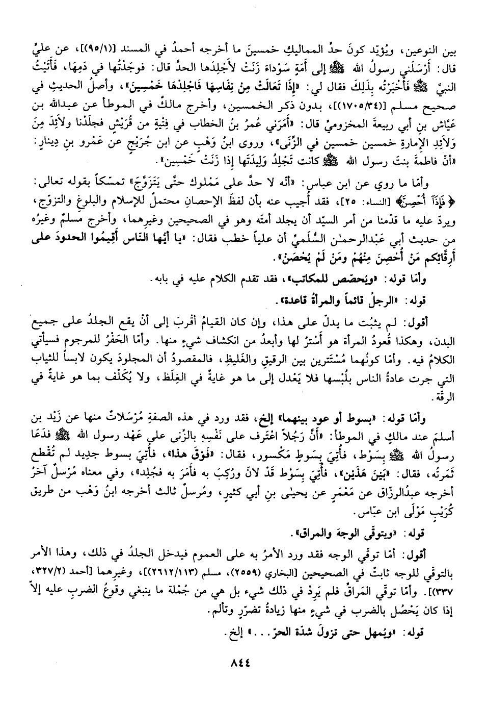 بين النوعين ويؤيد كون حد المماليك خمسين ما أخرجه أحمد في المسند "1/95"، عن علي قال: أرسلني رسول الله صلى الله عليه وسلم إلى أمة سوداء زنت لأجلدها الحد قال فوجدتها في دمها فأتيت النبي صلى الله عليه وسلم فأخبرته بذلك فقال لي: "إذا تعالت من نفاسها فاجلدها خمسين"، وأصل الحديث في صحيح مسلم بدون ذكر الخمسين وأخرج مالك في الموطأ عن عبد الله بن عياش بن أبي ربيعة المخزومي قال: أمرني عمر بن الخطاب في فتية من قريش فجلدنا ولائد من ولائد الإمارة خمسين خمسين في الزنا وروى ابن وهب عن ابن جريح عن عمرو بن دينار أن فاطمة بنت رسول الله صلى الله عليه وسلم كانت تجلد وليدتها إذا زنت خمسين.