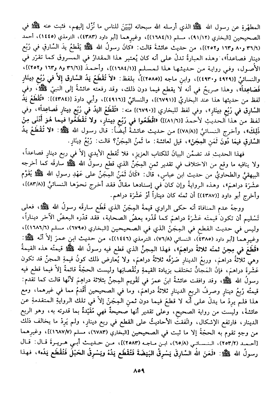 المطهرة عن رسول الله صلى الله عليه وسلم الذي أرسله الله سبحانه ليبين للناس ما نزل إليهم فثبت عنه صلى الله عليه وسلم في الصحيحين [البخاري "12/91" مسلم "1/1684"،] ، وغيرهما [أبو داود "4393"، الترمذي "1445"، أحمد "6/36، 80، 163، 252"، من حديث عائشة قالت: كان رسول الله صلى الله عليه وسلم يقطع يد السارق في ربع دينار فصاعدا وهذه العبارة تدل على أنه كان يعتبر هذا المقدار في المسروق كما تقرر في الأصول وفي رواية من حديثها هذا لمسلم "1/1684"، وأحمد "6/63، 8، 163، 252" والنسائي "4929، 4930"، وابن ماجة "2585"] ، بلفظ: "لا تقطع يد السارق إلا في ربع دينار فصاعدا"، وهذا صريح في أنه لا يقطع فيما دون ذلك وقد رفعته عائشة إلى النبي صلى الله عليه وسلم وفي لفظ من حديثها هذا عند البخاري "6790"، والنسائي "4916"، وأبي داود 4384"، "تقطع يد السارق في ربع دينار"، وفي لفظ للبخاري "6790"، منه: "تقطع اليد في ربع دينار فصاعدا"، وفي لفظ من هذا الحديث لأحمد "6/81"، "اقطعوا في ربع دينار ولا تقطعوا فيما هو أدنى من ذلك"، وأخرج النسائي "8/78"، من حديث عائشة أيضا: قال رسول الله صلى الله عليه وسلم: "لا تقطع يد السارق فيما دون ثمن المجن"، قيل لعائشة ما ثمن المجن قالت ربع دينار.
