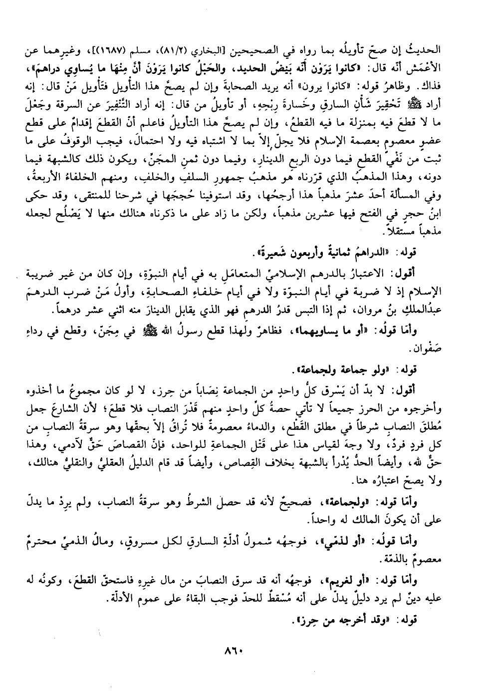 أقول: لا بد أن يسرق كل واحد من الجماعة نصابا من حرز لا لو كان مجموع ما أخذوه وأخرجوه من الحرز جميعا لا تأتي حصة كل واحد منهم قدر النصاب فلا قطع لأن الشارع جعل مطلق النصاب شرطا في مطلق القطع والدماء معصومة فلا تراق إلا بحقها وهو سرقة النصاب من كل فرد فرد ولا وجه لقياس هذا فعلي قتل الجماعة بالواحد فإن القصاص حق لآدمي وهذا حق لله وأيضا الحد يدرأ بالشبهة بخلاف القصاص وأيضا قام الدليل العقلي والنقلي هنالك ولا يصح اعتباره هنا.