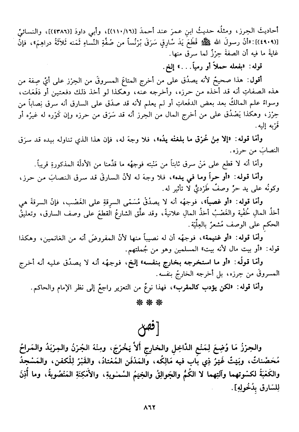 أحاديث الحرز ومثله حديث ابن عمر عند أحمد "16/110"، وأبي داود "4386"، والنسائي "4909"، أن رسول الله صلى الله عليه وسلم قطع يد سارق سرق برنسا من صفة النساء ثمنه ثلاثة دراهم فإن غاية ما فيه أن الصفة حرز لما سرق منها.